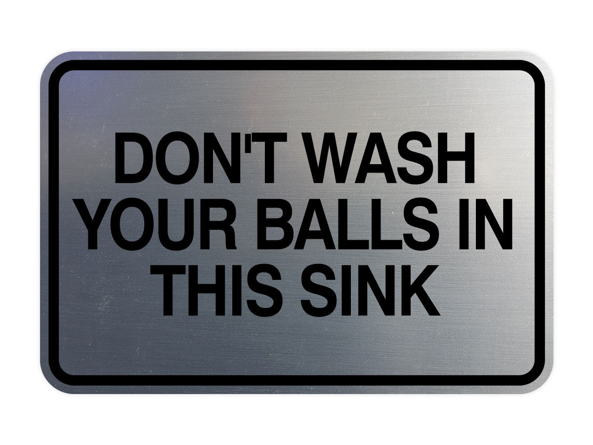 Our Signs ByLITA Classic Framed Don't Wash Your Balls in this Sink Sign can be attached to the door, wall or window of your home or business. The sign text and design work is laser engraved into sturdy plastic. Each sign comes with an adhesive foam backing, allowing them to be attached to any flat surface. Comes in multiple colors. Our sink signs are great for your home or business.