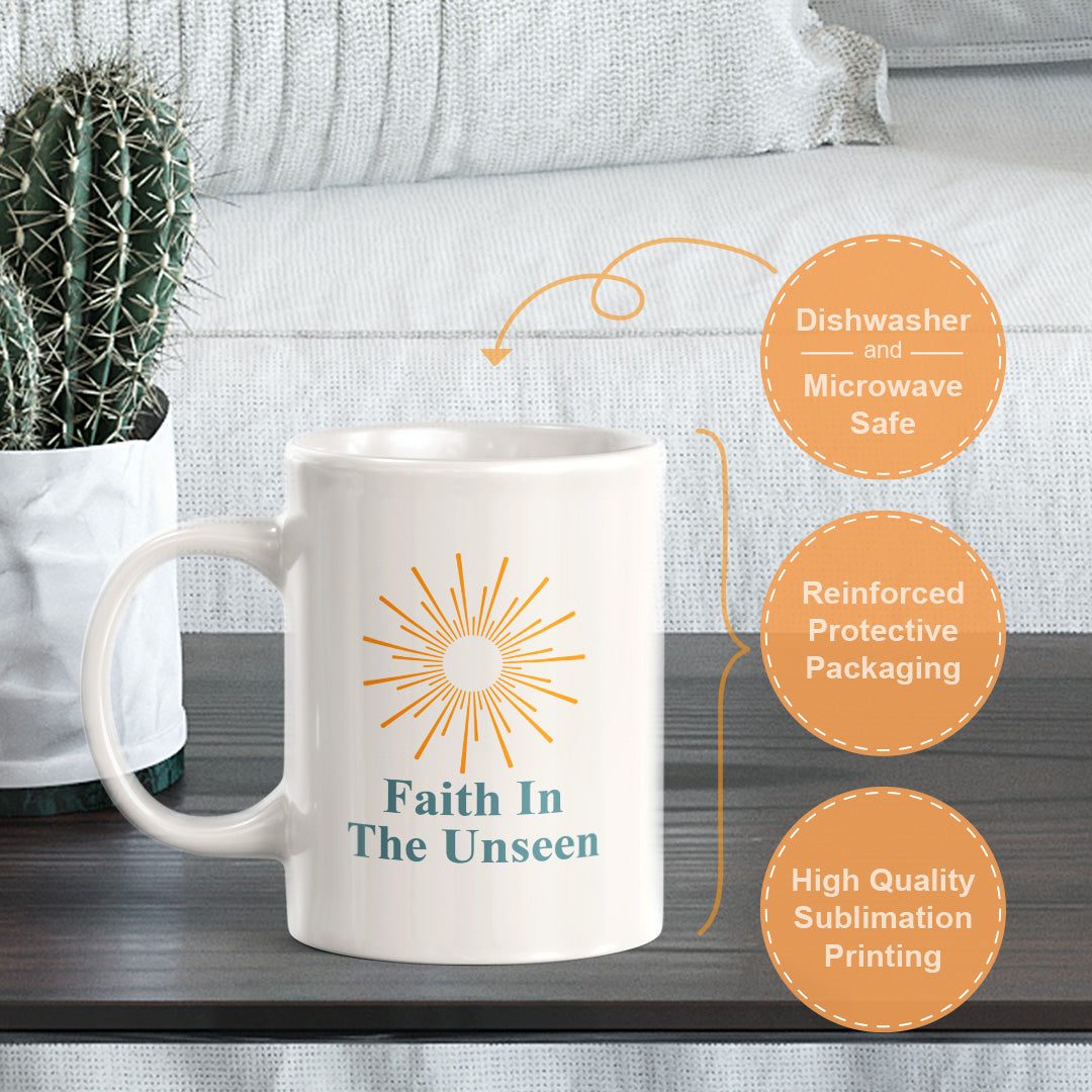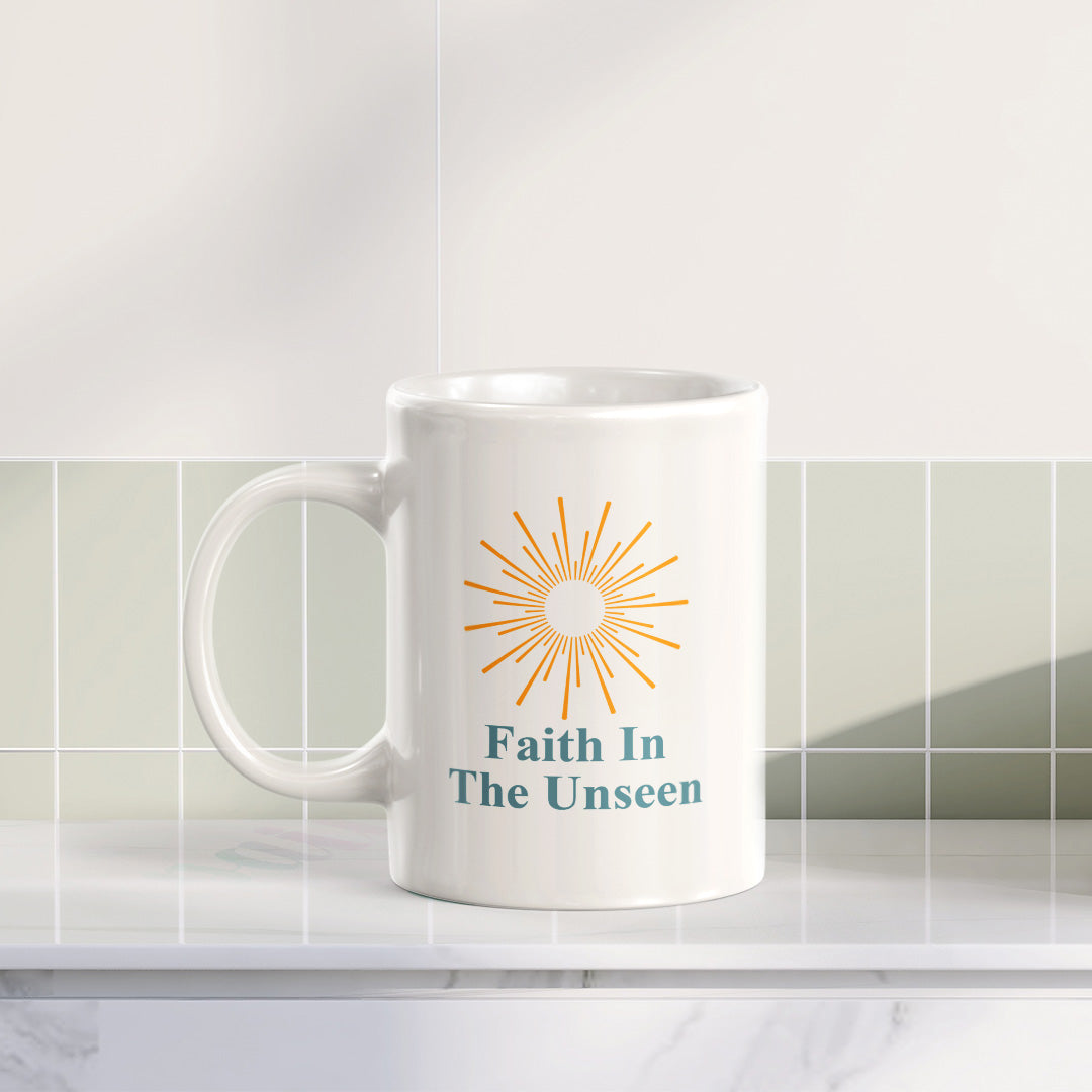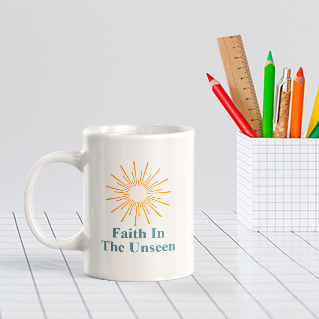 Faith In The Unseen Coffee Mug. This mug is great for your home, office or workspace. Perfect gift for your friends and family, be sure to check out our other religious sayings mug designs!