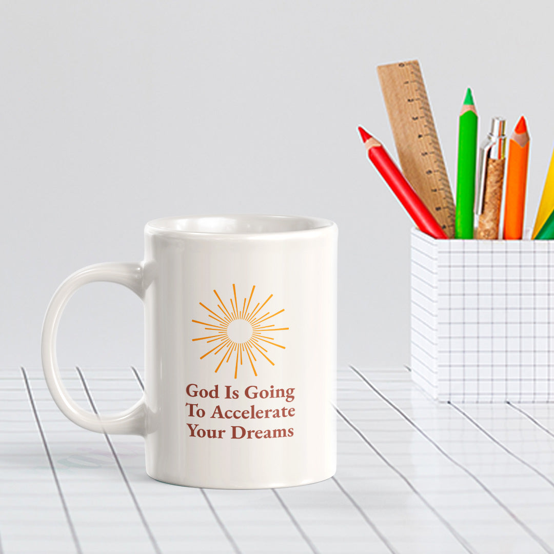 God Is Going To Accelerate Your Dreams Coffee Mug. This mug is great for your home, office or workspace. Perfect gift for your friends and family, be sure to check out our other religious sayings mug designs!