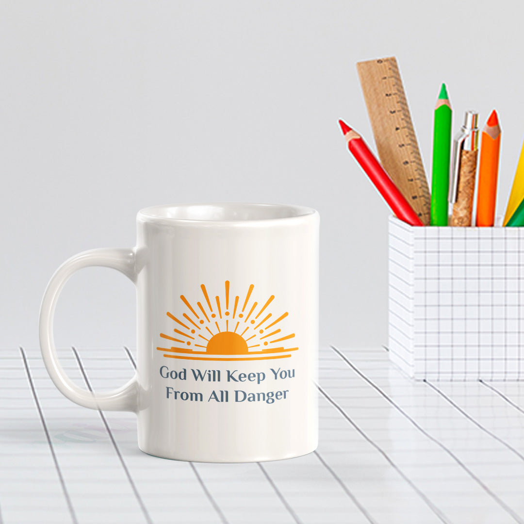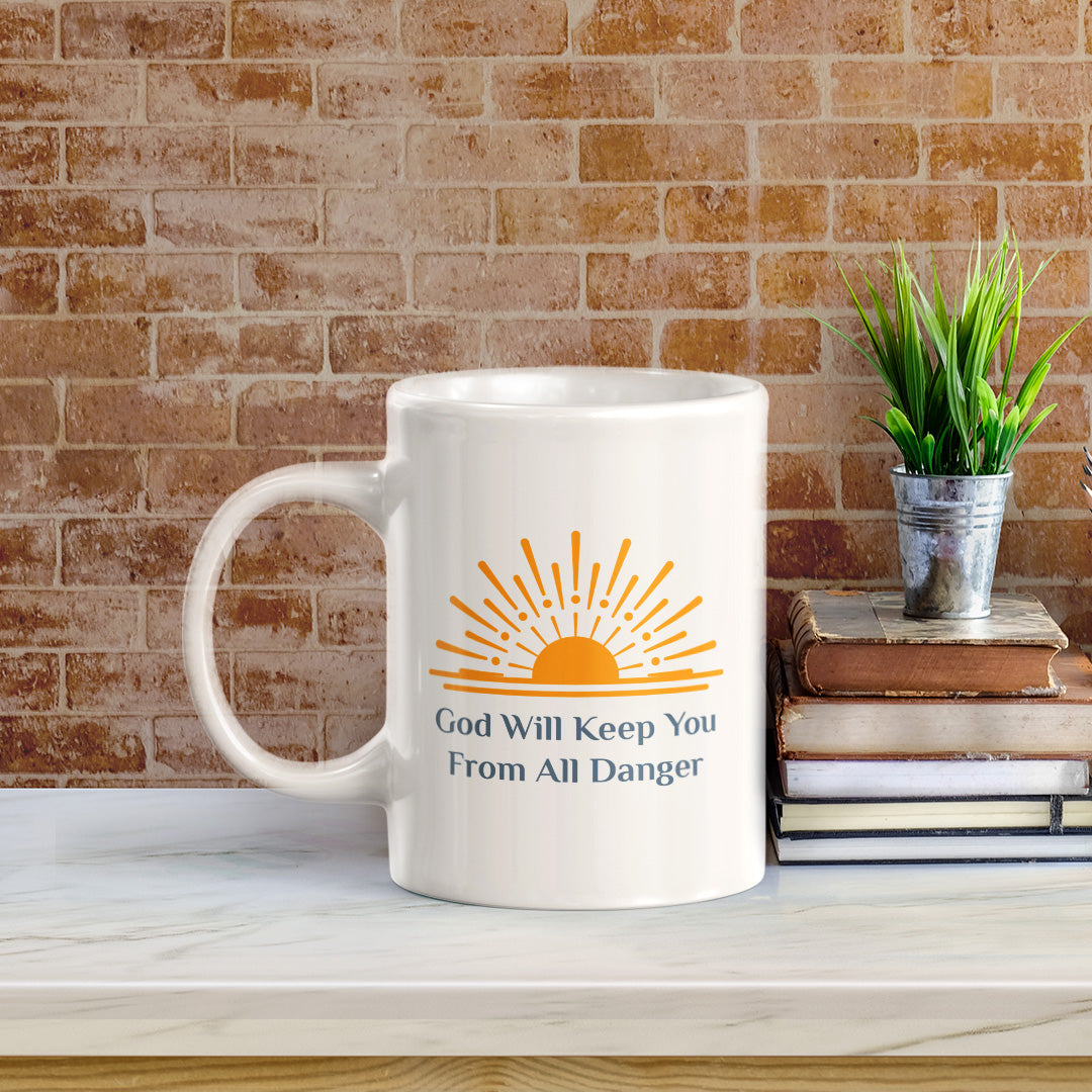 God Will Keep You From All Danger Coffee Mug. This mug is great for your home, office or workspace. Perfect gift for your friends and family, be sure to check out our other religious sayings mug designs!