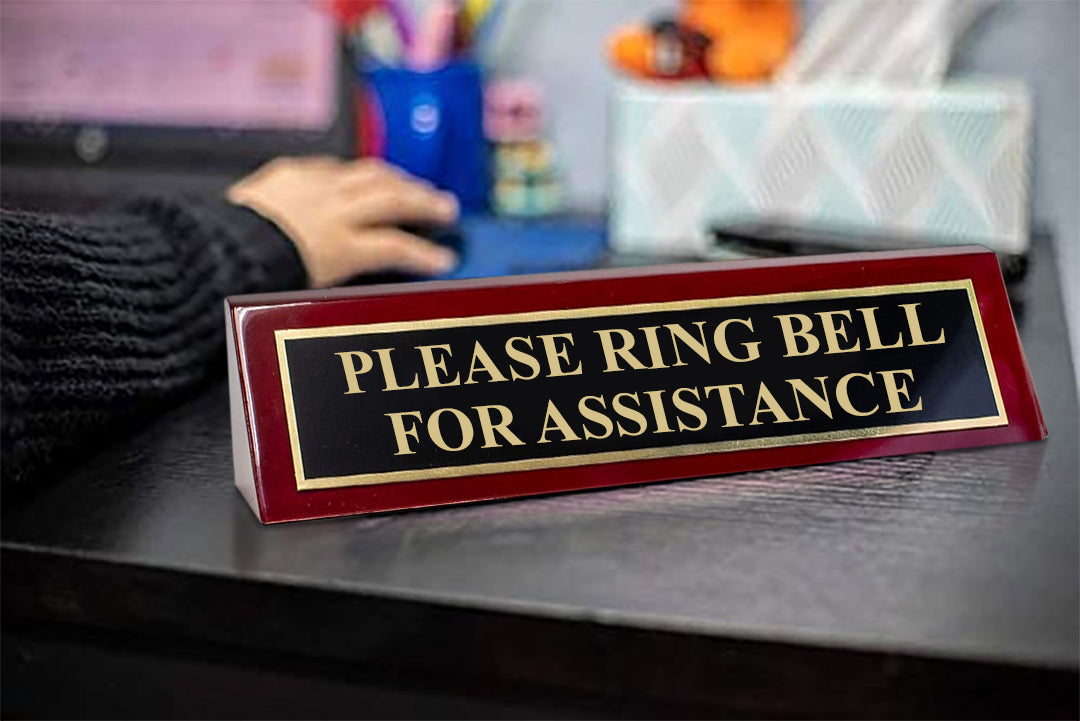Piano Finished Rosewood Standard Engraved Desk Name Plate 'Please Ring Bell For Assistance', 2" x 8", Black/Gold Plate