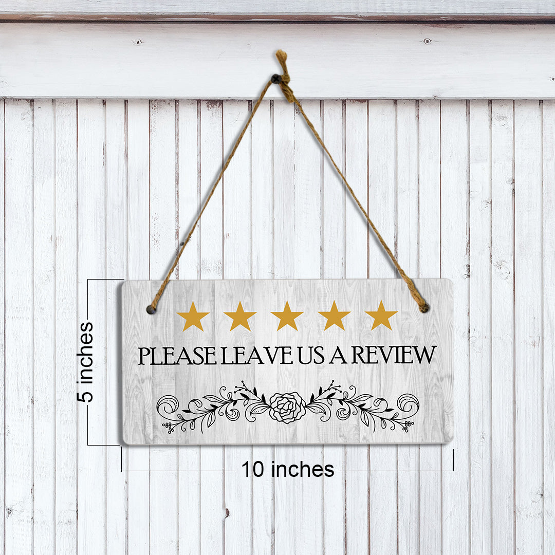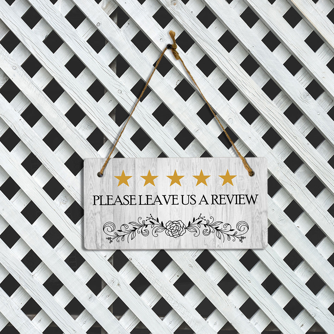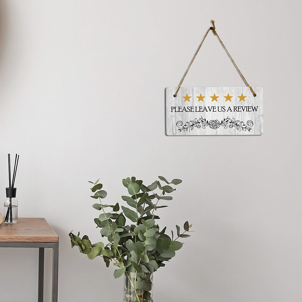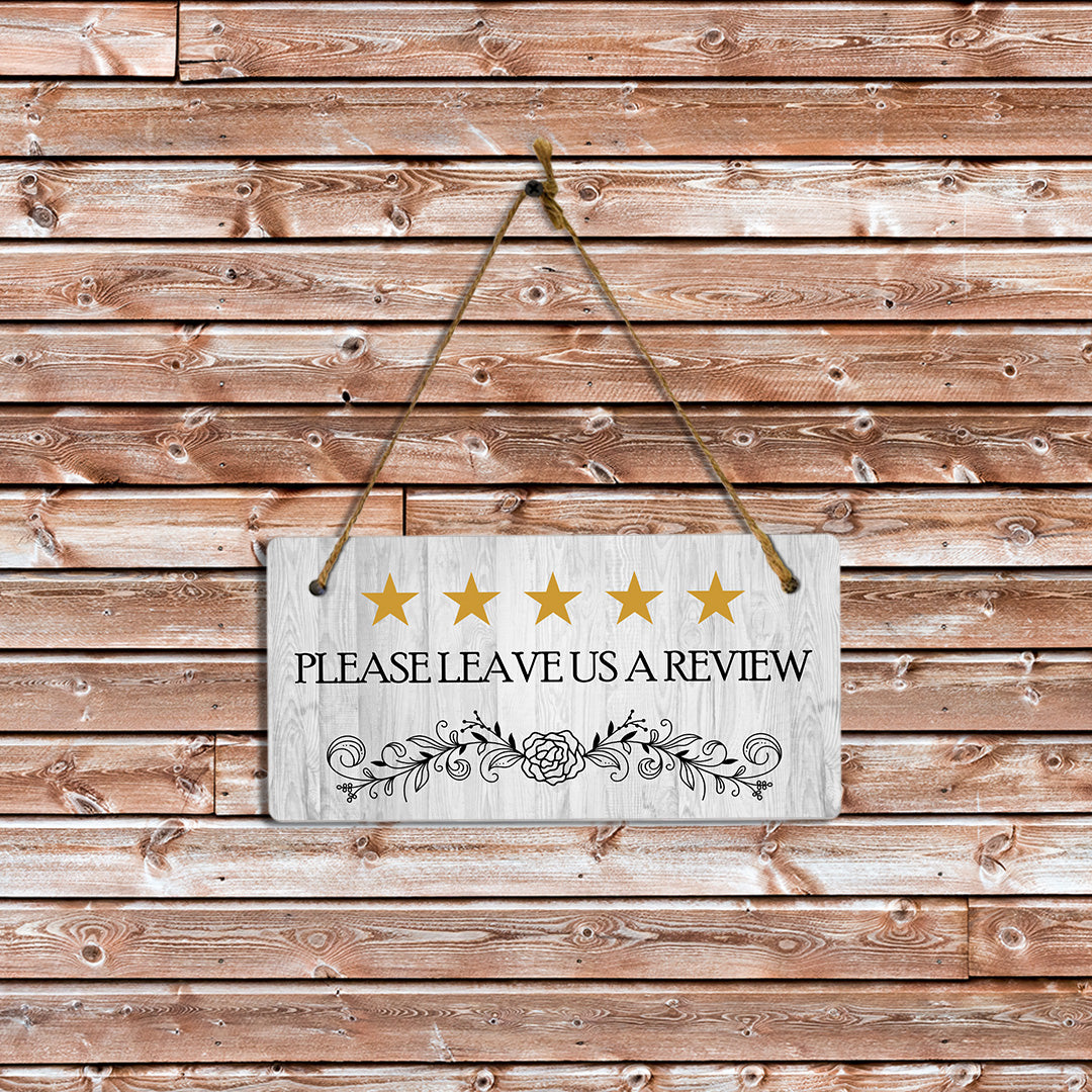Introducing our versatile and stylish 5 Stars Please Leave Us A Review, the perfect blend of style and sophistication to elevate your home or workplace. Our 5x10 Hanging Sign range is the perfect choice for your home, workplace or business. Each sign is attached with rustic twine, providing a charming and versatile accent for any space. Our curated designs effortlessly complement a variety of styles, from rustic farmhouse or Modern Chic, to simple and functional options. Choose from our diverse range of designs to personalize your space. Whether it's a warm welcome at the entrance, a motivational quote for your workspace, or a playful touch for the kids' room, our Hanging Wall or Door Signs are the perfect way to express your unique style.