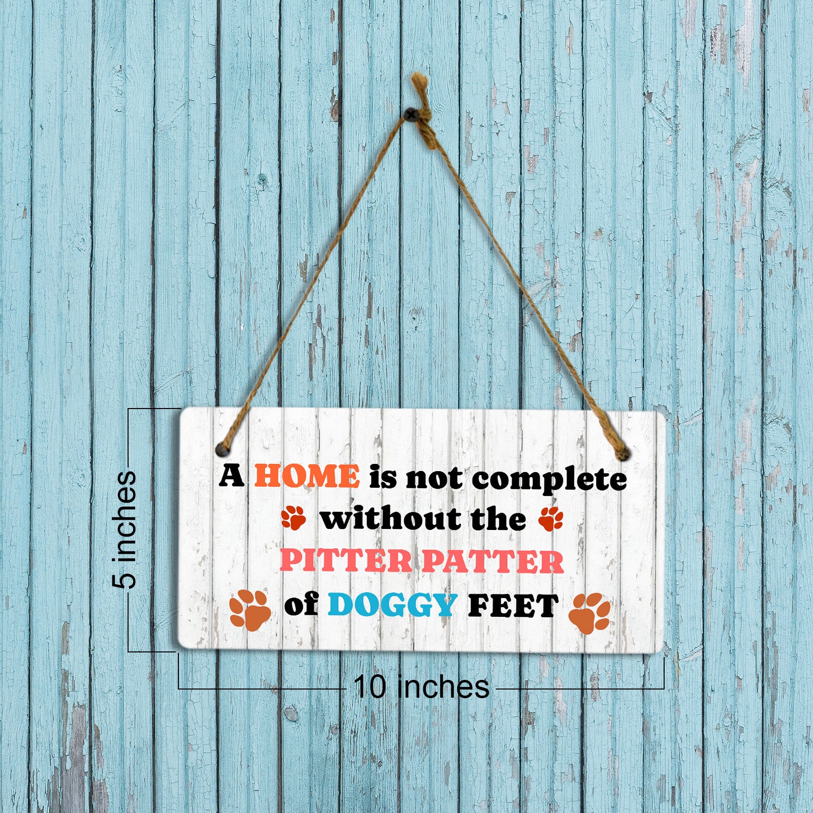 Introducing our versatile and stylish A Home Is Not Complete Without The Pitter Patter Of Doggy Feet, the perfect blend of style and sophistication to elevate your home or workplace. Our 5x10 Hanging Sign range is the perfect choice for your home, workplace or business. Each sign is attached with rustic twine, providing a charming and versatile accent for any space. Our curated designs effortlessly complement a variety of styles, from rustic farmhouse or Modern Chic, to simple and functional options. Choose from our diverse range of designs to personalize your space. Whether it's a warm welcome at the entrance, a motivational quote for your workspace, or a playful touch for the kids' room, our Hanging Wall or Door Signs are the perfect way to express your unique style.