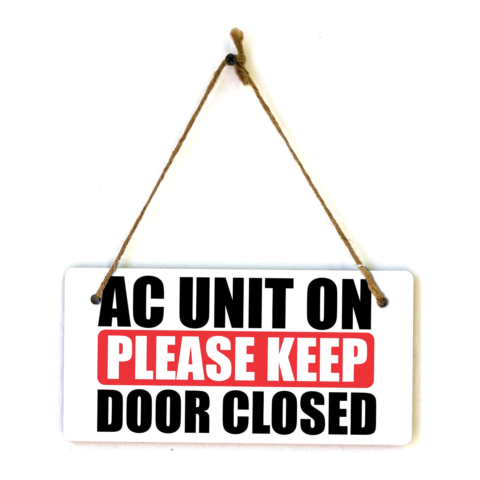 Introducing our versatile and stylish AC Unit On Please Keep Door Closed, the perfect blend of style and sophistication to elevate your home or workplace. Our 5x10 Hanging Sign range is the perfect choice for your home, workplace or business. Each sign is attached with rustic twine, providing a charming and versatile accent for any space. Our curated designs effortlessly complement a variety of styles, from rustic farmhouse or Modern Chic, to simple and functional options. Choose from our diverse range of designs to personalize your space. Whether it's a warm welcome at the entrance, a motivational quote for your workspace, or a playful touch for the kids' room, our Hanging Wall or Door Signs are the perfect way to express your unique style.