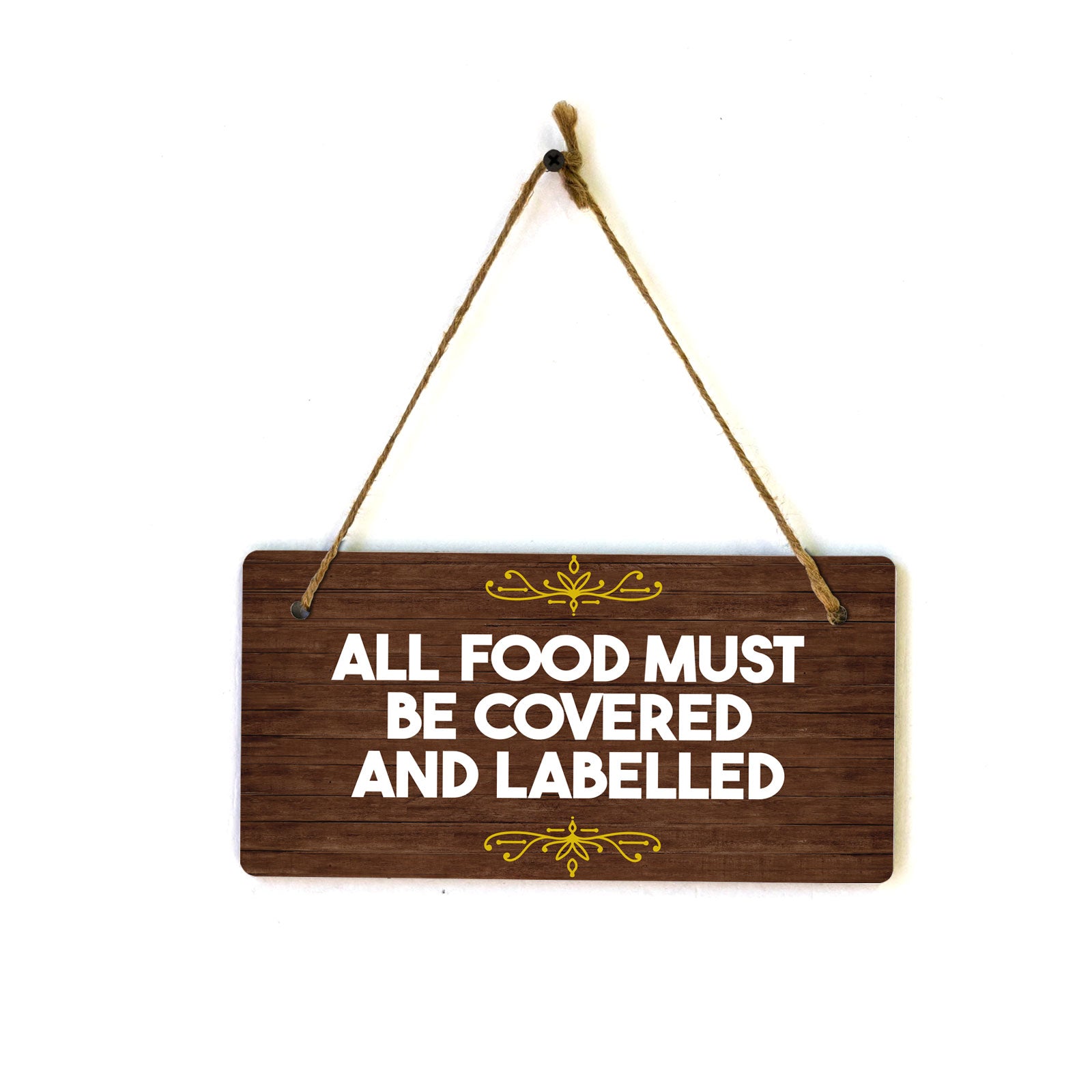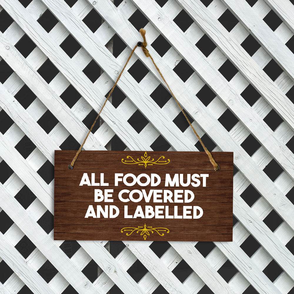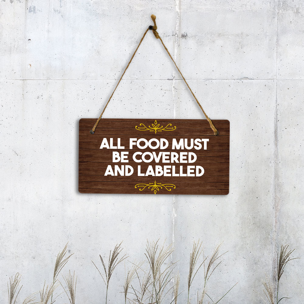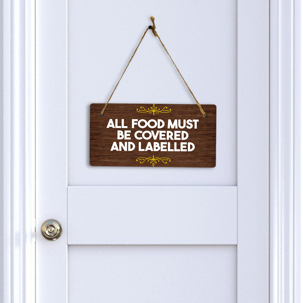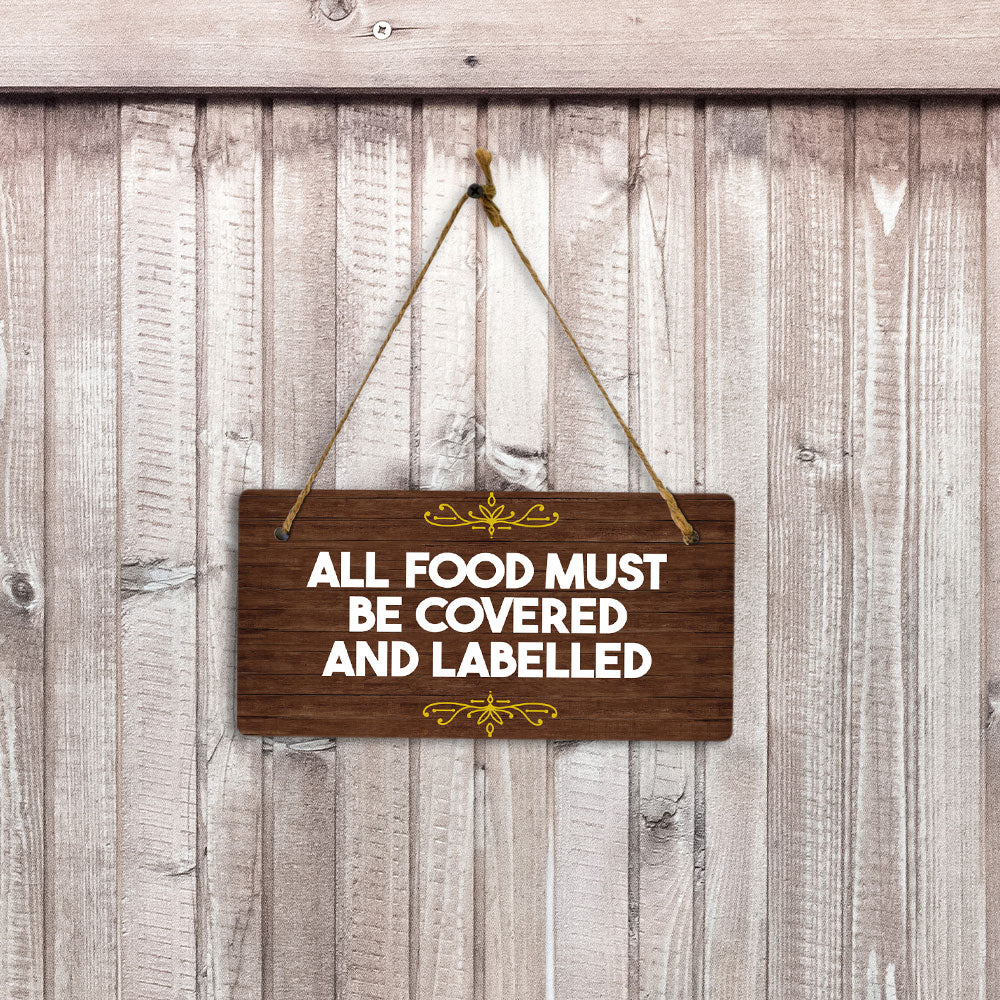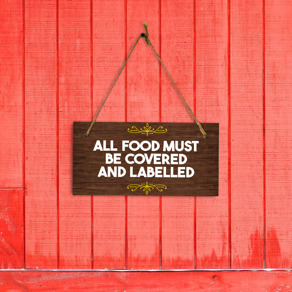 Introducing our versatile and stylish All Food Must Be Covered and Labelled, the perfect blend of style and sophistication to elevate your home or workplace. Our 5x10 Hanging Sign range is the perfect choice for your home, workplace or business. Each sign is attached with rustic twine, providing a charming and versatile accent for any space. Our curated designs effortlessly complement a variety of styles, from rustic farmhouse or Modern Chic, to simple and functional options. Choose from our diverse range of designs to personalize your space. Whether it's a warm welcome at the entrance, a motivational quote for your workspace, or a playful touch for the kids' room, our Hanging Wall or Door Signs are the perfect way to express your unique style.