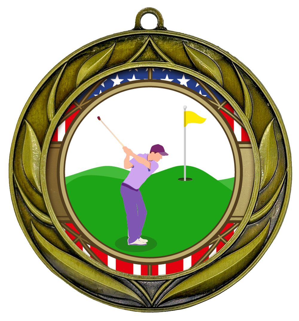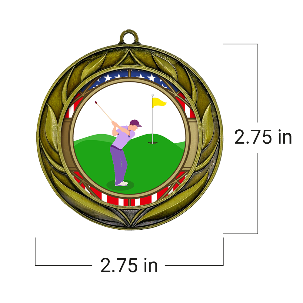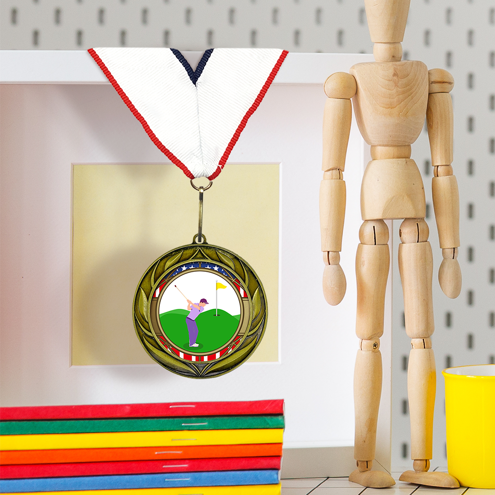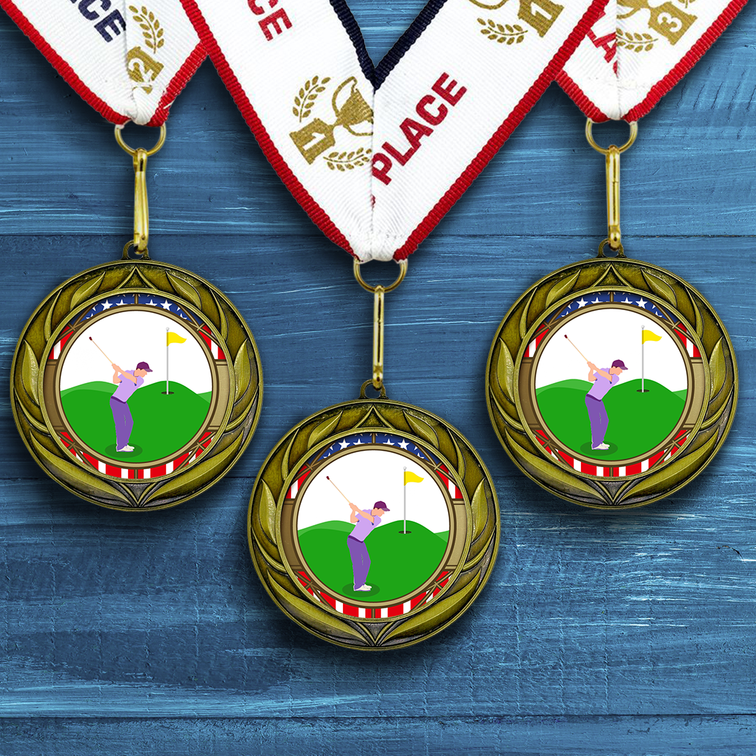 Recognize the remarkable achievements of Golfers with the All Quality Golf Wreath Design Medal - 1st, 2nd, 3rd Place. This set of three medals is designed to celebrate the outstanding performances of the top three winners in your events.Crafted with meticulous attention to detail, these medals feature a generous antique gold-colored medallion with a striking 2.75-inch diameter, ensuring they stand out and make a lasting impression. The medals are made from heavy zinc metal, guaranteeing their durability and substantial feel. Unlike cheap plastic imitations, these medals are crafted to be cherished keepsakes.The highlight of these medals is the intricate high relief Wreath design, adding an elegant and captivating element to their appearance. At the center, you'll find a beautiful USA flag design, symbolizing the passion and dedication of recipients. Each medal comes with a custom red, white, and blue ribbon, perfectly complementing the USA flag design and featuring "1st Place," "2nd Place," or "3rd Place" markings to denote the placement.Ideal for tournaments, leagues, or school events, these medals are the perfect way to honor the top performers and commemorate their success. Celebrate achievement and reward excellence with the All Quality Golf Wreath Design Medal - 1st, 2nd, 3rd Place.