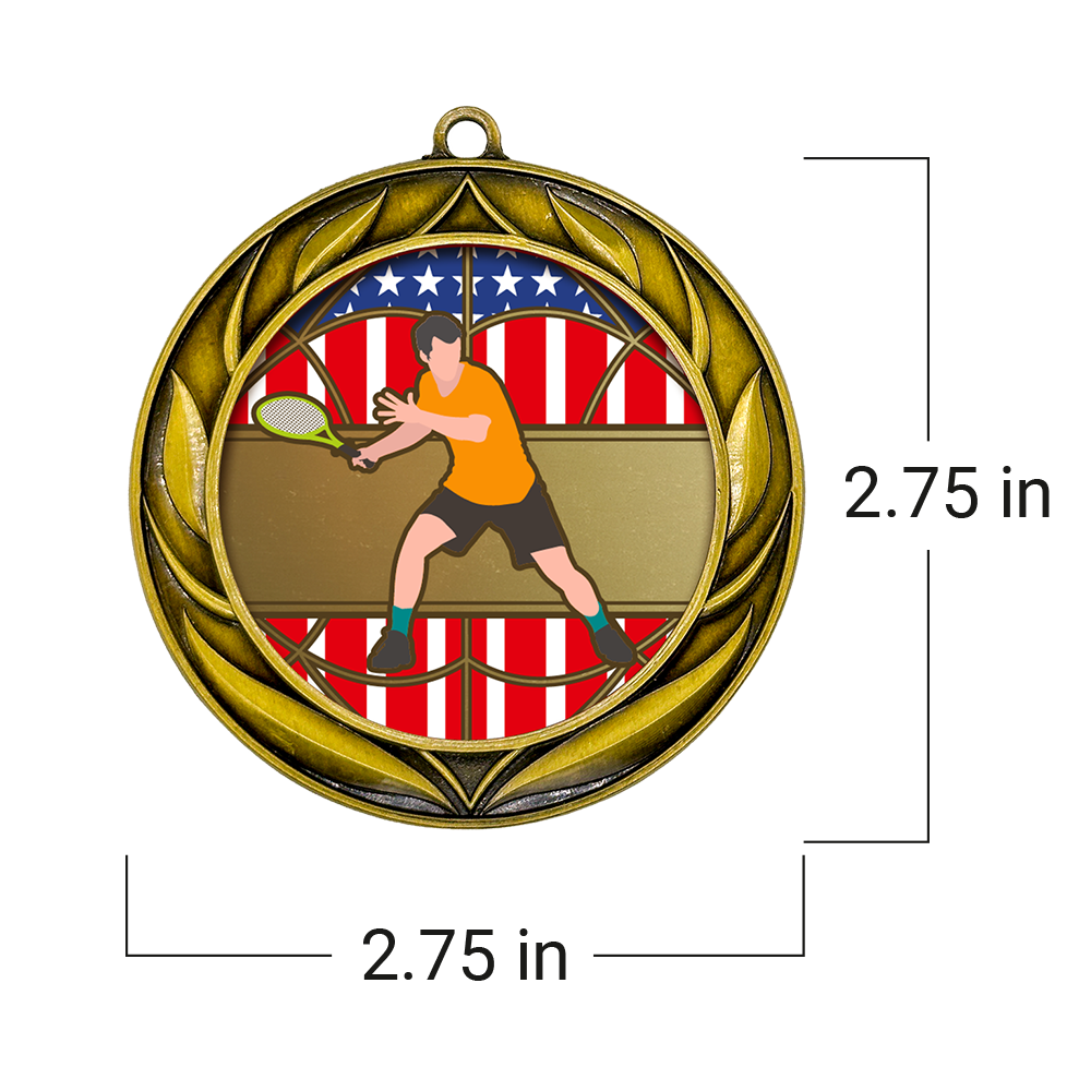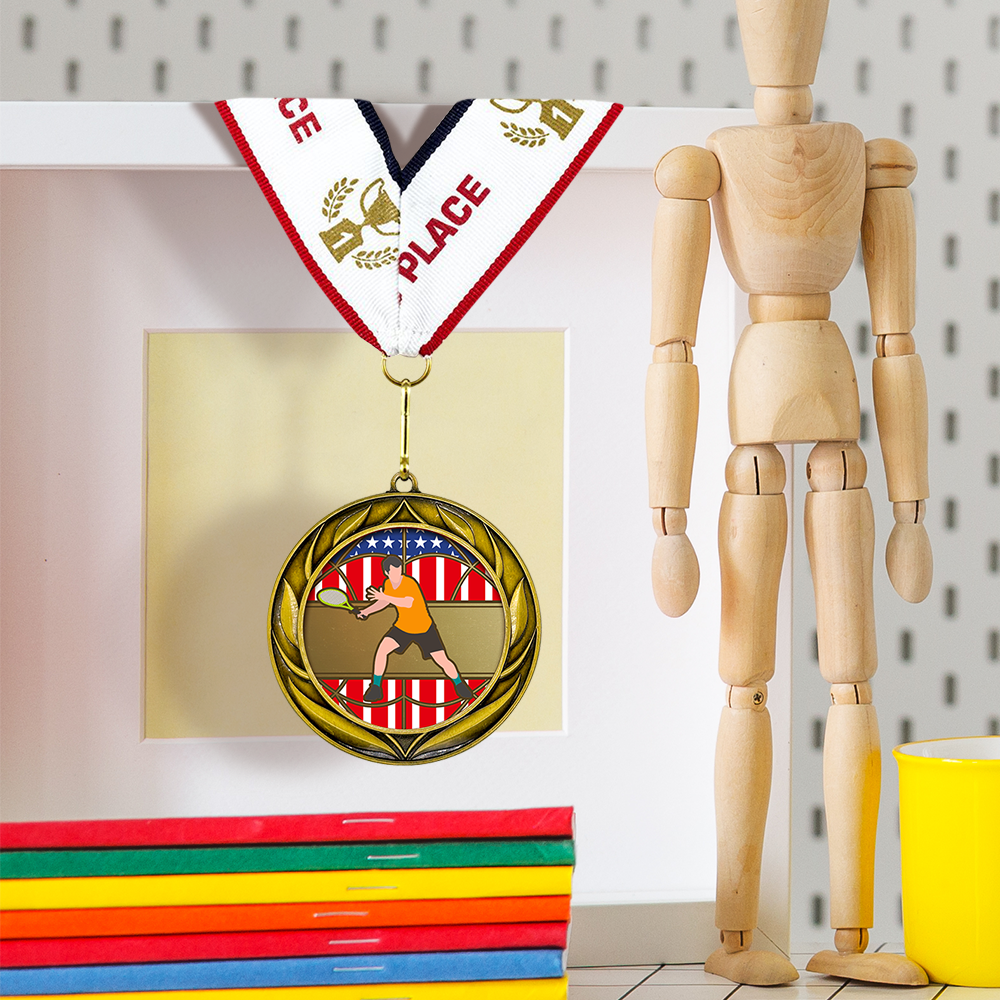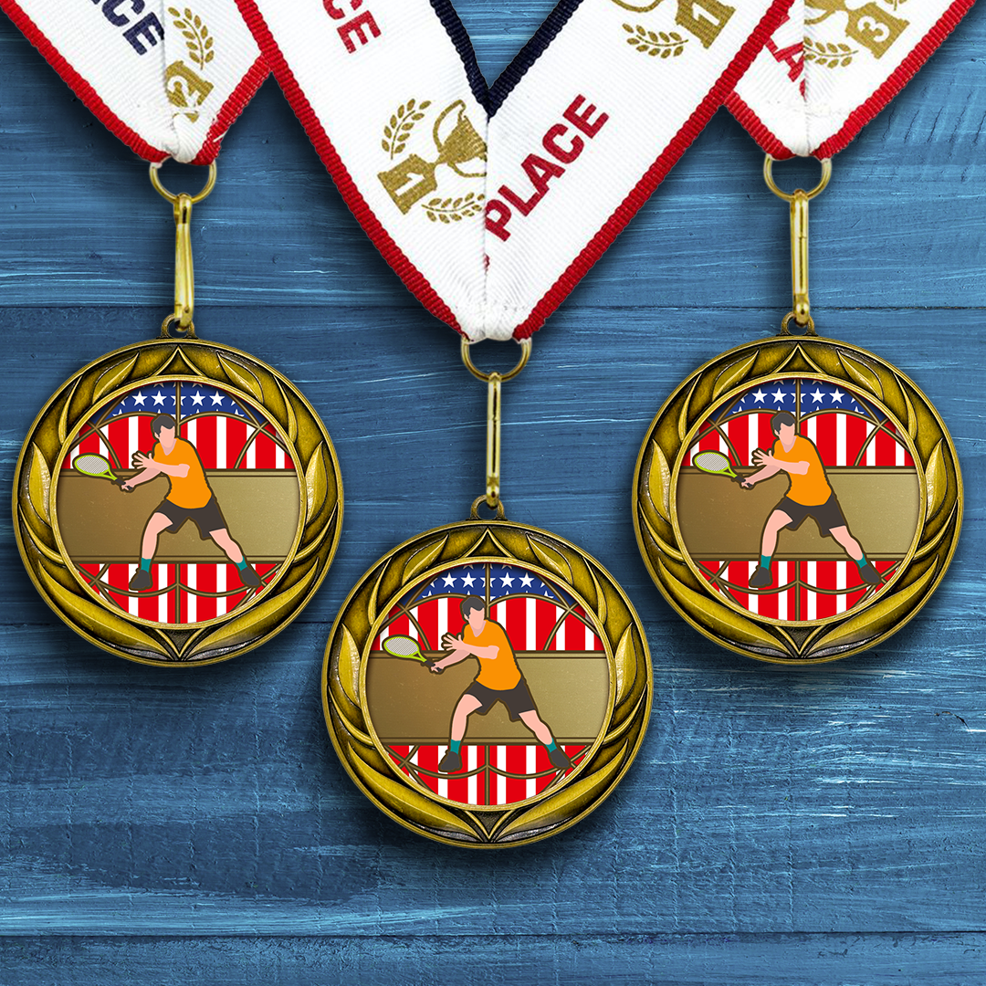 Recognize competitors' achievements with the All Quality Tennis Wreath Design Medal - 1st, 2nd, 3rd Place. This set of three medals is designed to celebrate the outstanding performances of the top three winners in your events.Crafted with meticulous attention to detail, these medals feature a generous antique gold-colored medallion with a striking 2.75-inch diameter, ensuring they stand out and make a lasting impression. The medals are made from heavy zinc metal, guaranteeing their durability and substantial feel. Unlike cheap plastic imitations, these medals are crafted to be cherished keepsakes.The highlight of these medals is the intricate high relief Wreath design, adding an elegant and captivating element to their appearance. At the center, you'll find a beautiful USA flag design, symbolizing the passion and dedication of recipients. Each medal comes with a custom red, white, and blue ribbon, perfectly complementing the USA flag design and featuring "1st Place," "2nd Place," or "3rd Place" markings to denote the placement.