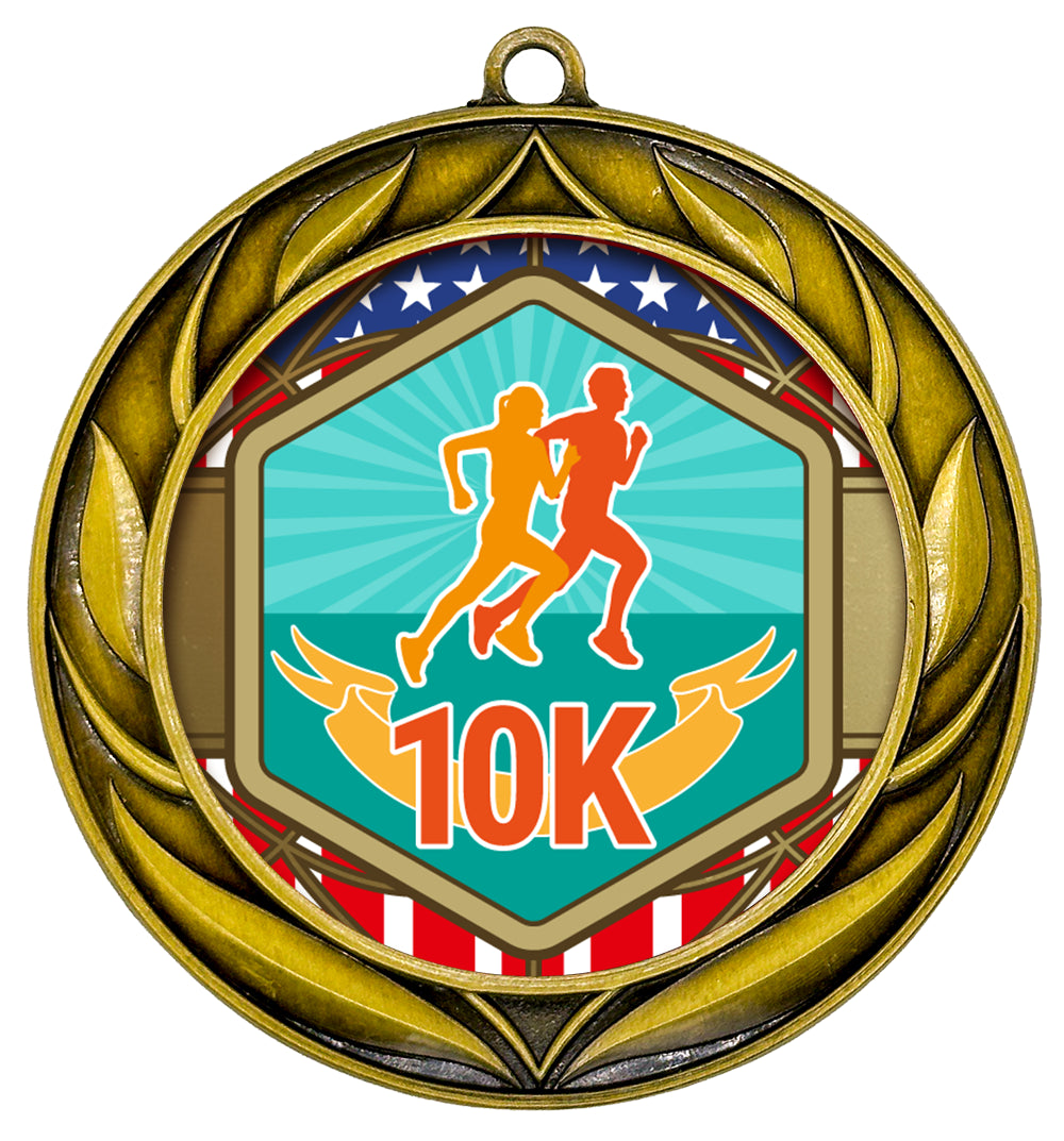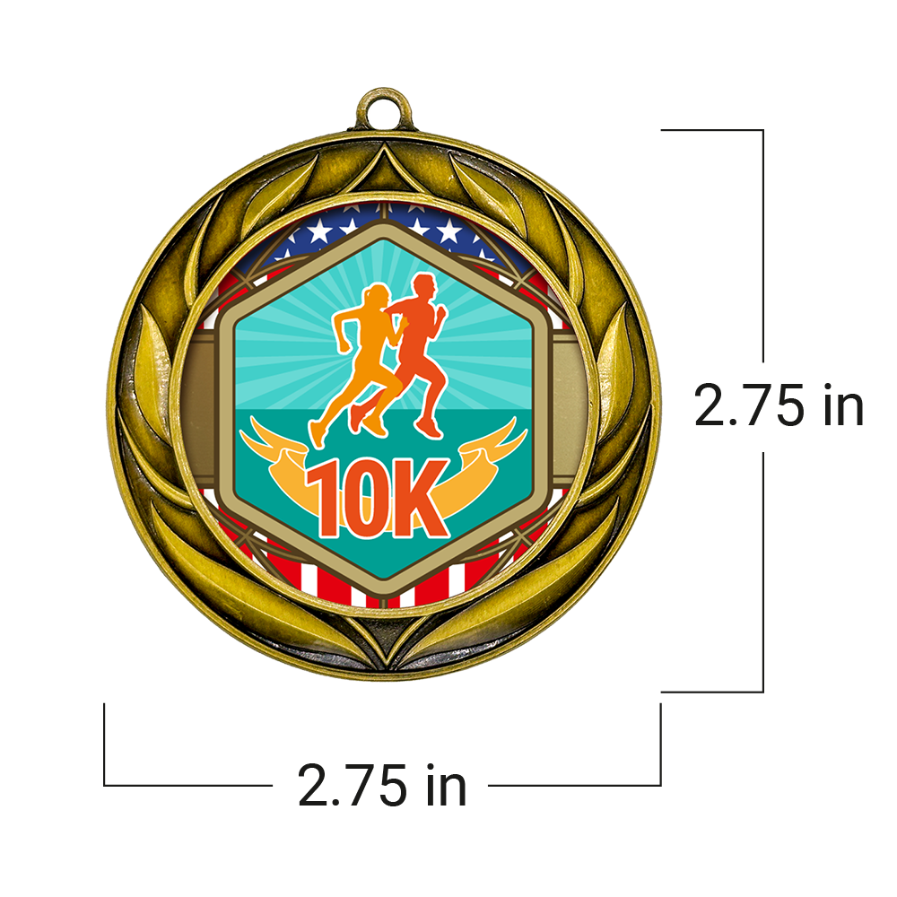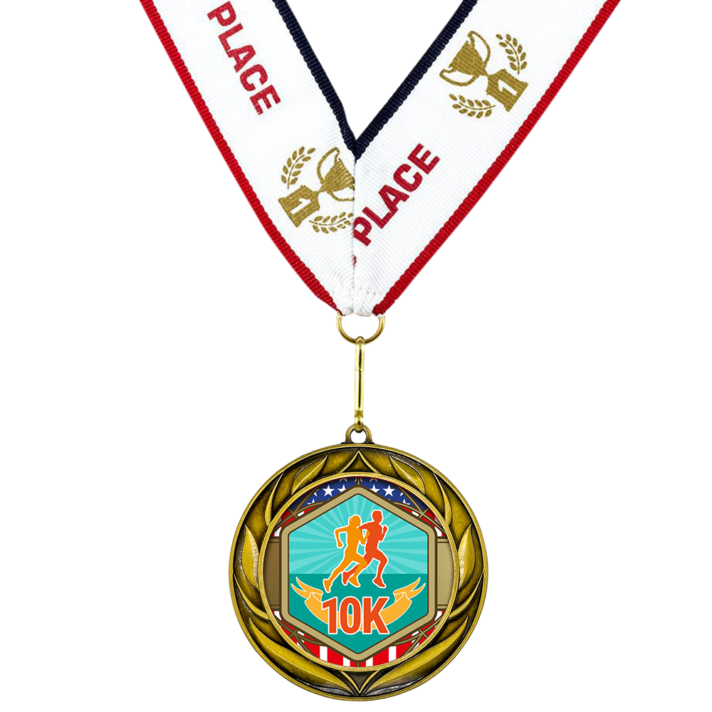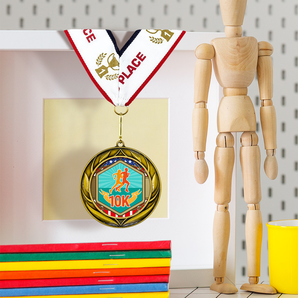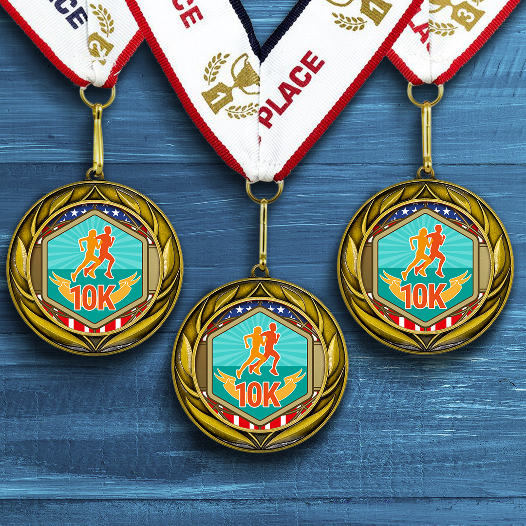 Recognize competitors' achievements with the All Quality Wreath Design 10k Medal - 1st, 2nd, 3rd Place. This set of three medals is designed to celebrate the outstanding performances of the top three winners in your events.Crafted with meticulous attention to detail, these medals feature a generous antique gold-colored medallion with a striking 2.75-inch diameter, ensuring they stand out and make a lasting impression. The medals are made from heavy zinc metal, guaranteeing their durability and substantial feel. Unlike cheap plastic imitations, these medals are crafted to be cherished keepsakes.The highlight of these medals is the intricate high relief Wreath design, adding an elegant and captivating element to their appearance. At the center, you'll find a beautiful USA flag design, symbolizing the passion and dedication of recipients. Each medal comes with a custom red, white, and blue ribbon, perfectly complementing the USA flag design and featuring "1st Place," "2nd Place," or "3rd Place" markings to denote the placement.