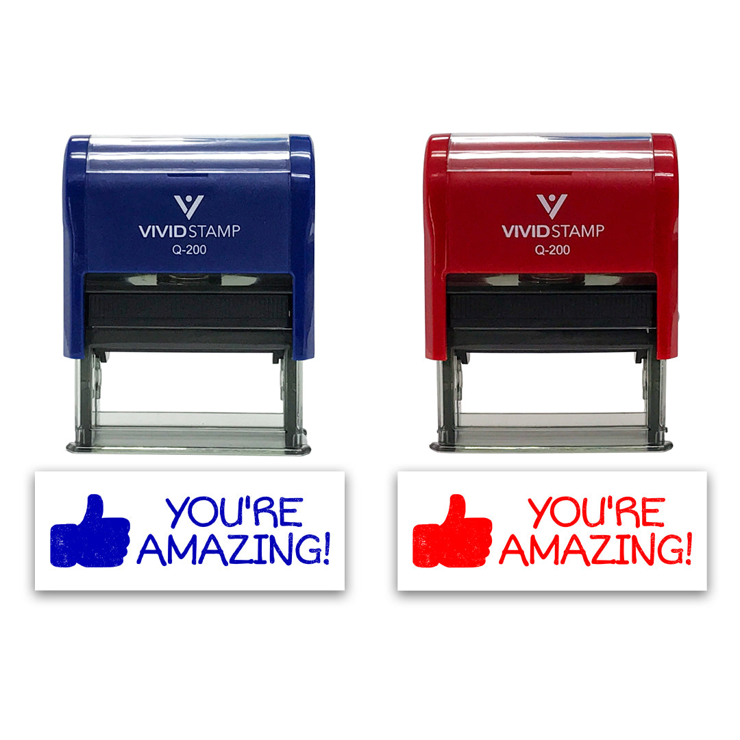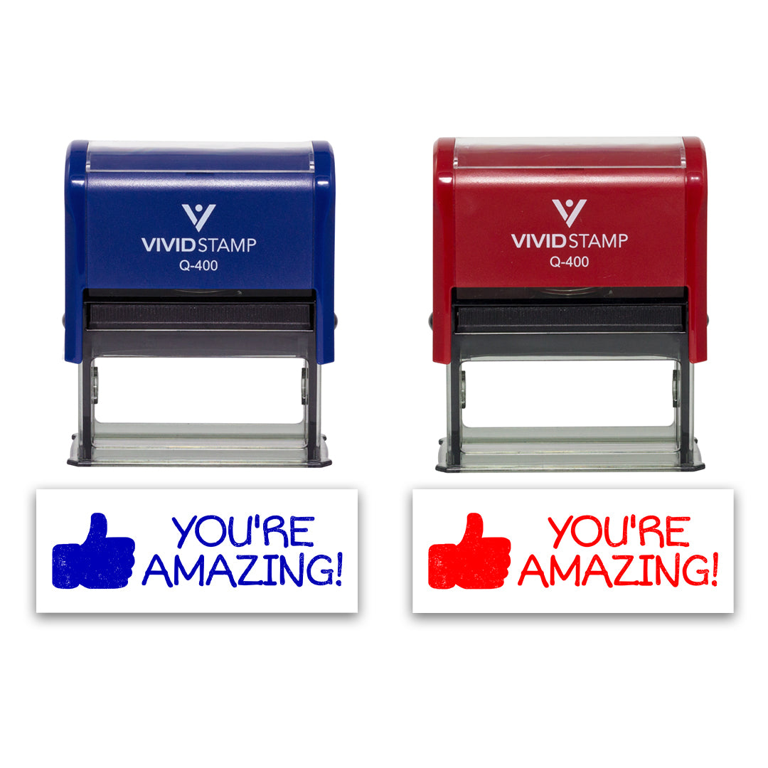 All Quality You're Amazing! Self-Inking Rubber Stamp. Provides thousands of Impressions. Re-inkable stamp with Transparent bottom allow for precise stamp alignment. Comes in multiple colors.
