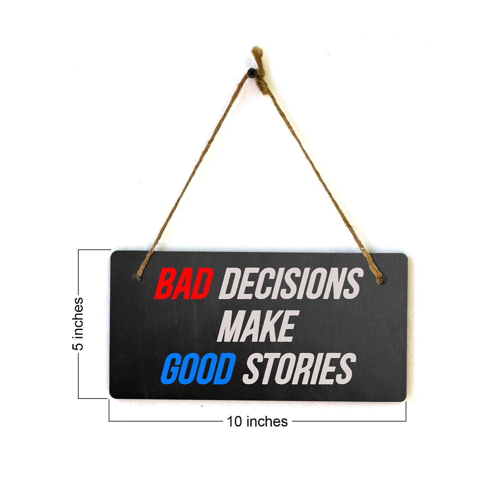 Introducing our versatile and stylish Bad Decisions Make Good Stories, the perfect blend of style and sophistication to elevate your home or workplace. Our 5x10 Hanging Sign range is the perfect choice for your home, workplace or business. Each sign is attached with rustic twine, providing a charming and versatile accent for any space. Our curated designs effortlessly complement a variety of styles, from rustic farmhouse or Modern Chic, to simple and functional options. Choose from our diverse range of designs to personalize your space. Whether it's a warm welcome at the entrance, a motivational quote for your workspace, or a playful touch for the kids' room, our Hanging Wall or Door Signs are the perfect way to express your unique style.