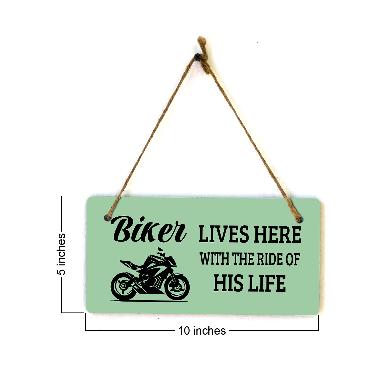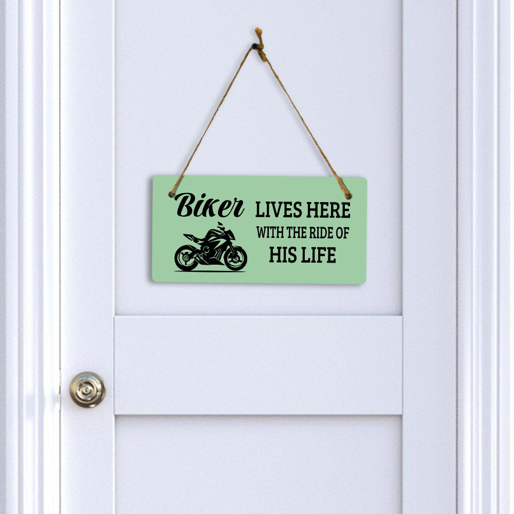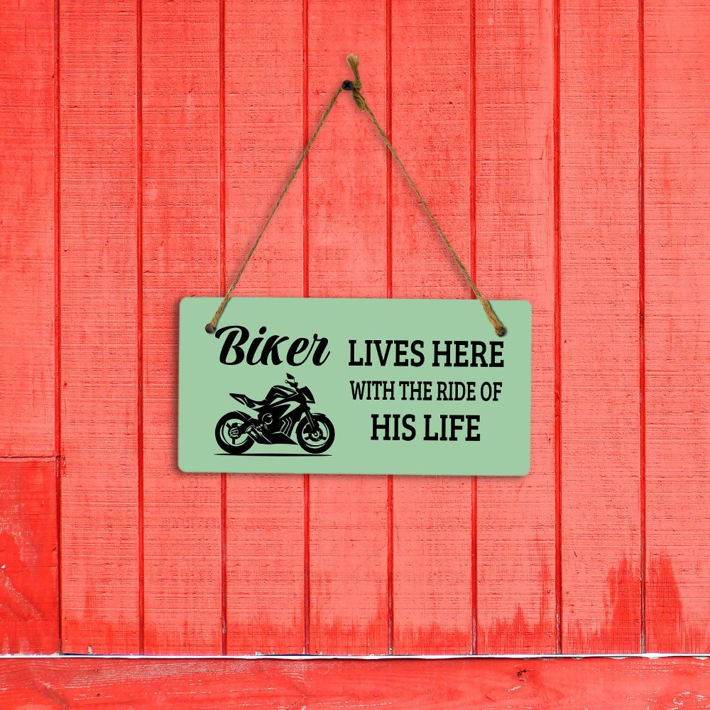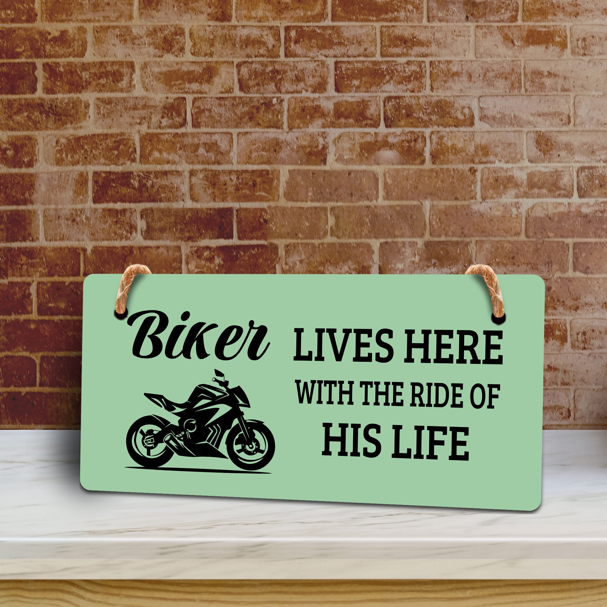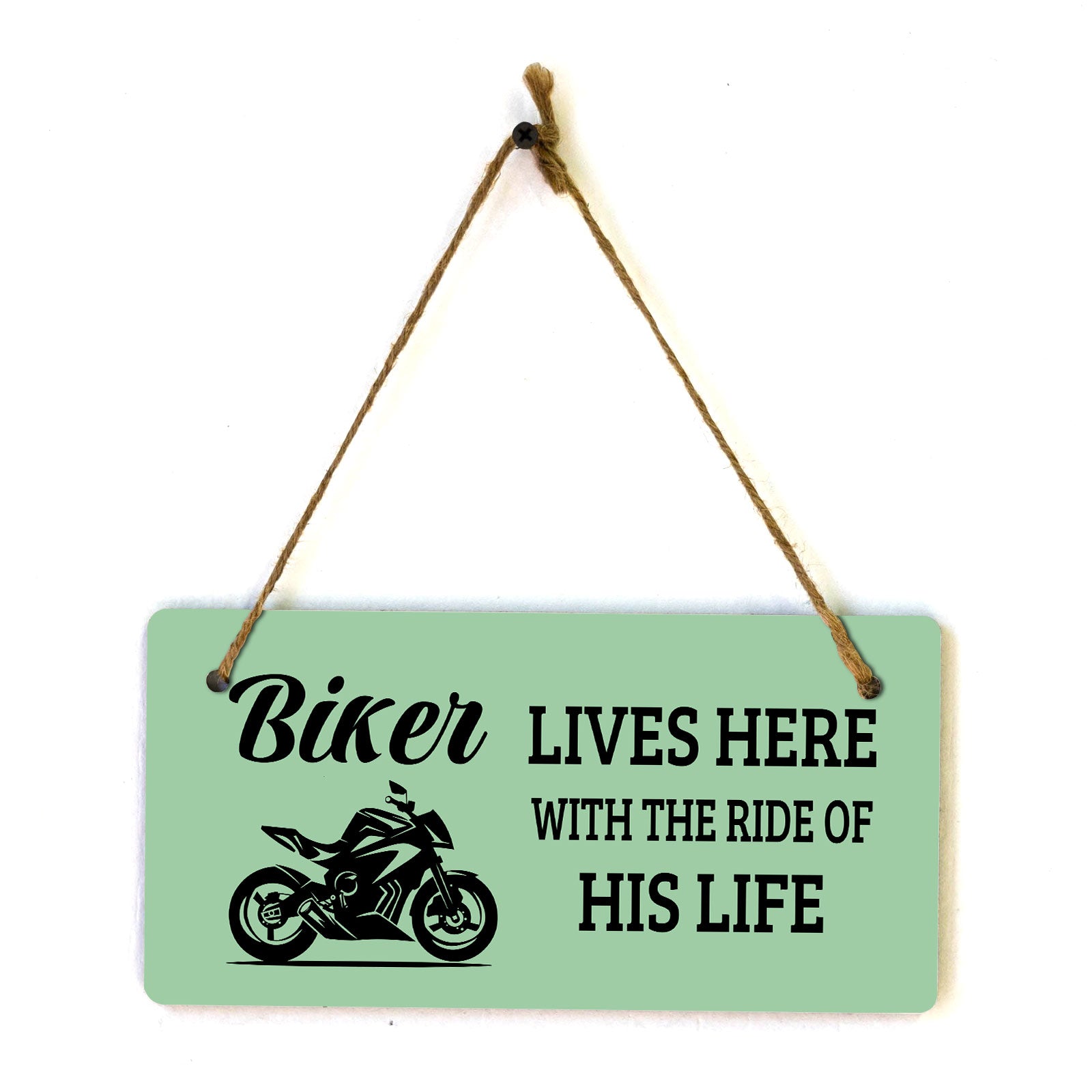 Introducing our versatile and stylish Biker Lives Here With The Ride Of His Life, the perfect blend of style and sophistication to elevate your home or workplace. Our 5x10 Hanging Sign range is the perfect choice for your home, workplace or business. Each sign is attached with rustic twine, providing a charming and versatile accent for any space. Our curated designs effortlessly complement a variety of styles, from rustic farmhouse or Modern Chic, to simple and functional options. Choose from our diverse range of designs to personalize your space. Whether it's a warm welcome at the entrance, a motivational quote for your workspace, or a playful touch for the kids' room, our Hanging Wall or Door Signs are the perfect way to express your unique style.