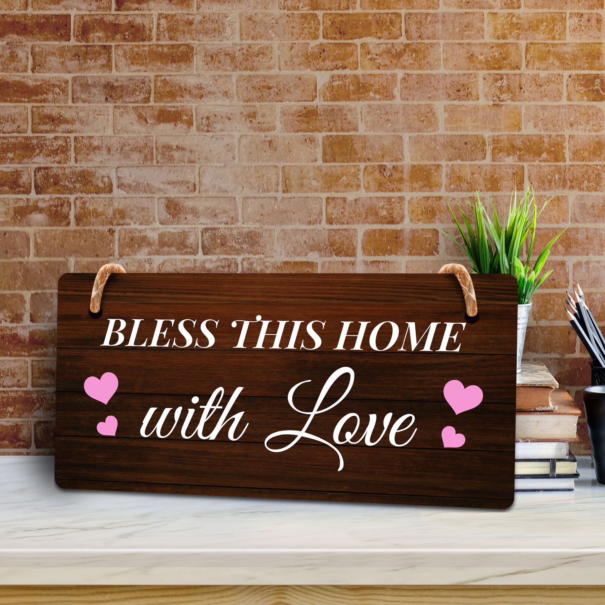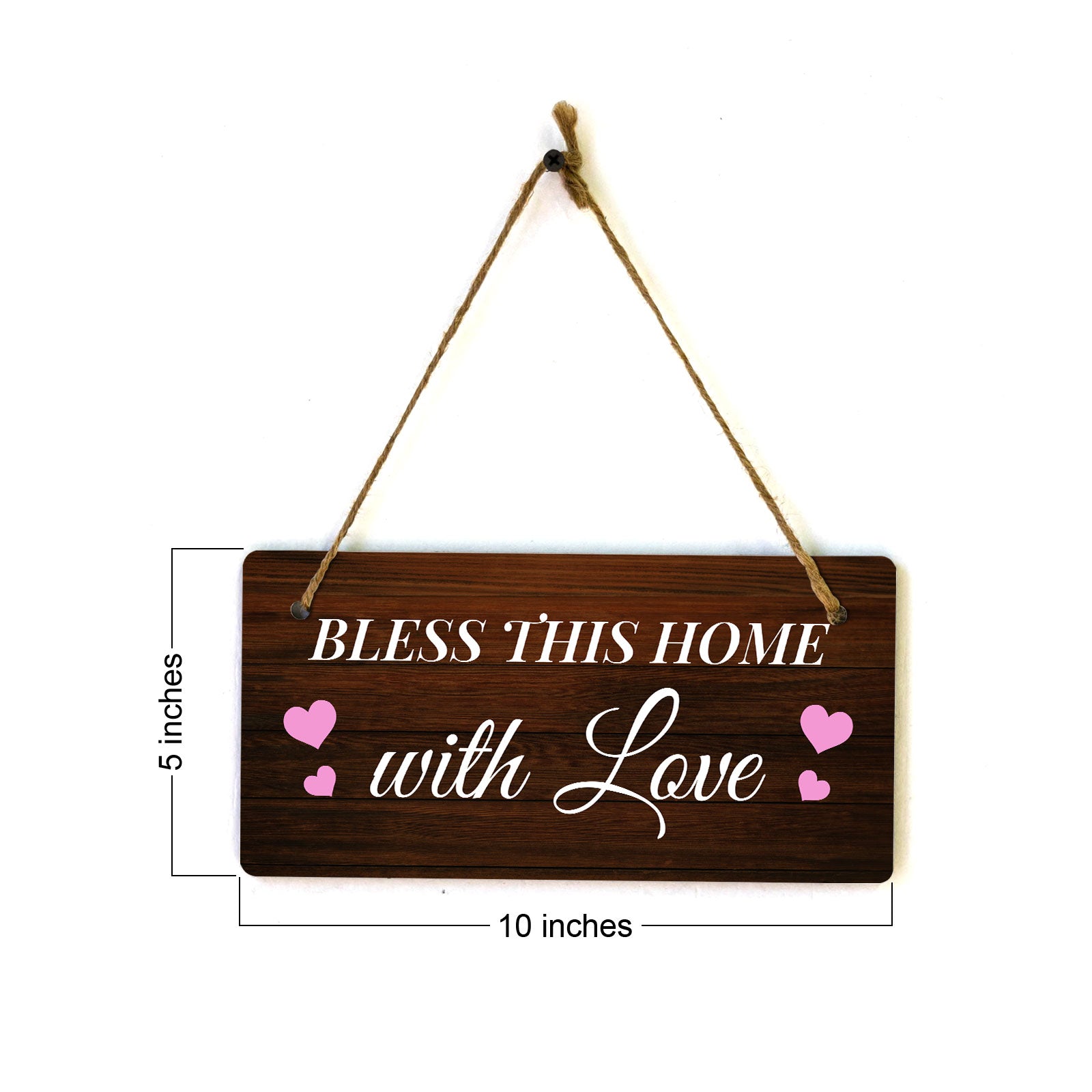 Introducing our versatile and stylish Bless This Home With Love, the perfect blend of style and sophistication to elevate your home or workplace. Our 5x10 Hanging Sign range is the perfect choice for your home, workplace or business. Each sign is attached with rustic twine, providing a charming and versatile accent for any space. Our curated designs effortlessly complement a variety of styles, from rustic farmhouse or Modern Chic, to simple and functional options. Choose from our diverse range of designs to personalize your space. Whether it's a warm welcome at the entrance, a motivational quote for your workspace, or a playful touch for the kids' room, our Hanging Wall or Door Signs are the perfect way to express your unique style.