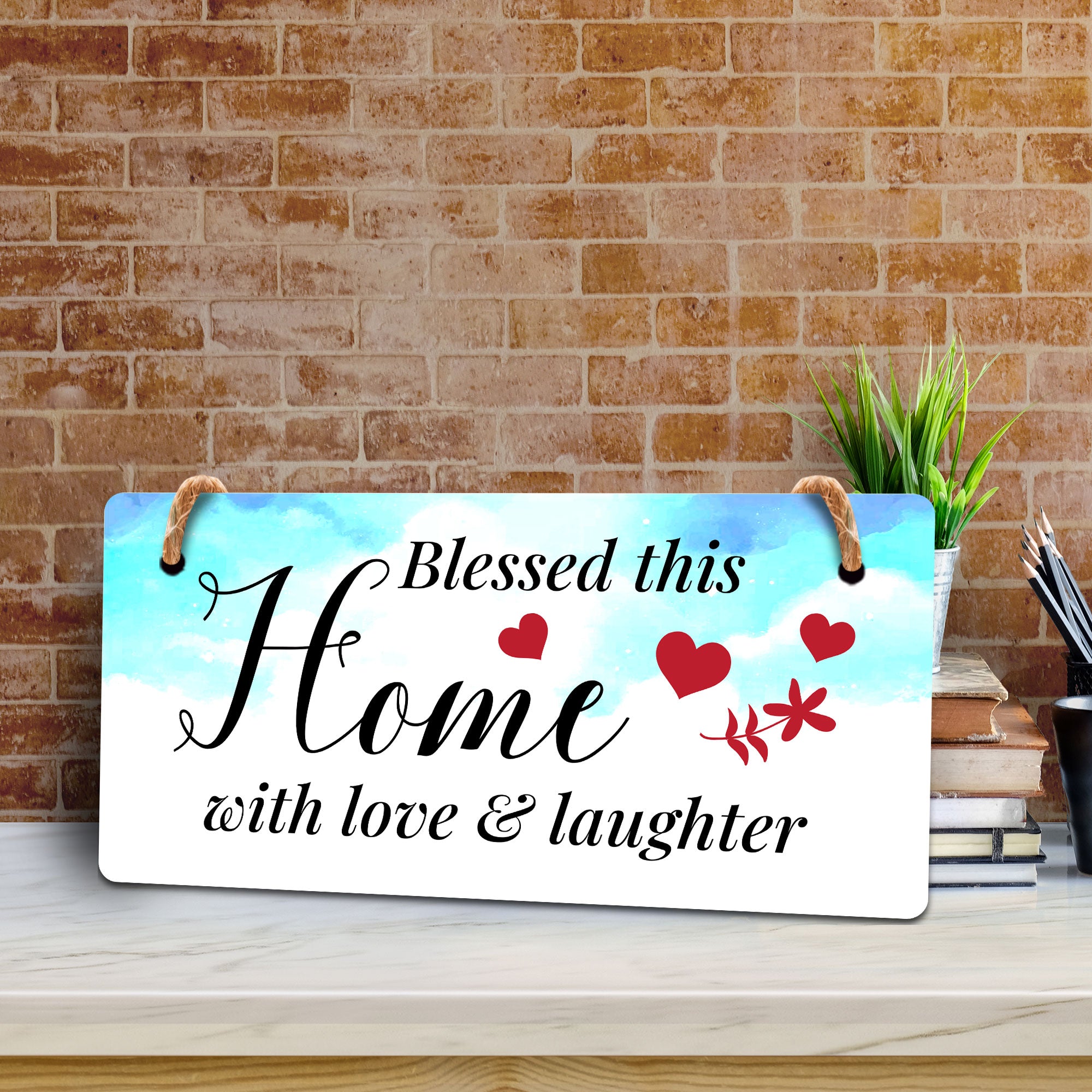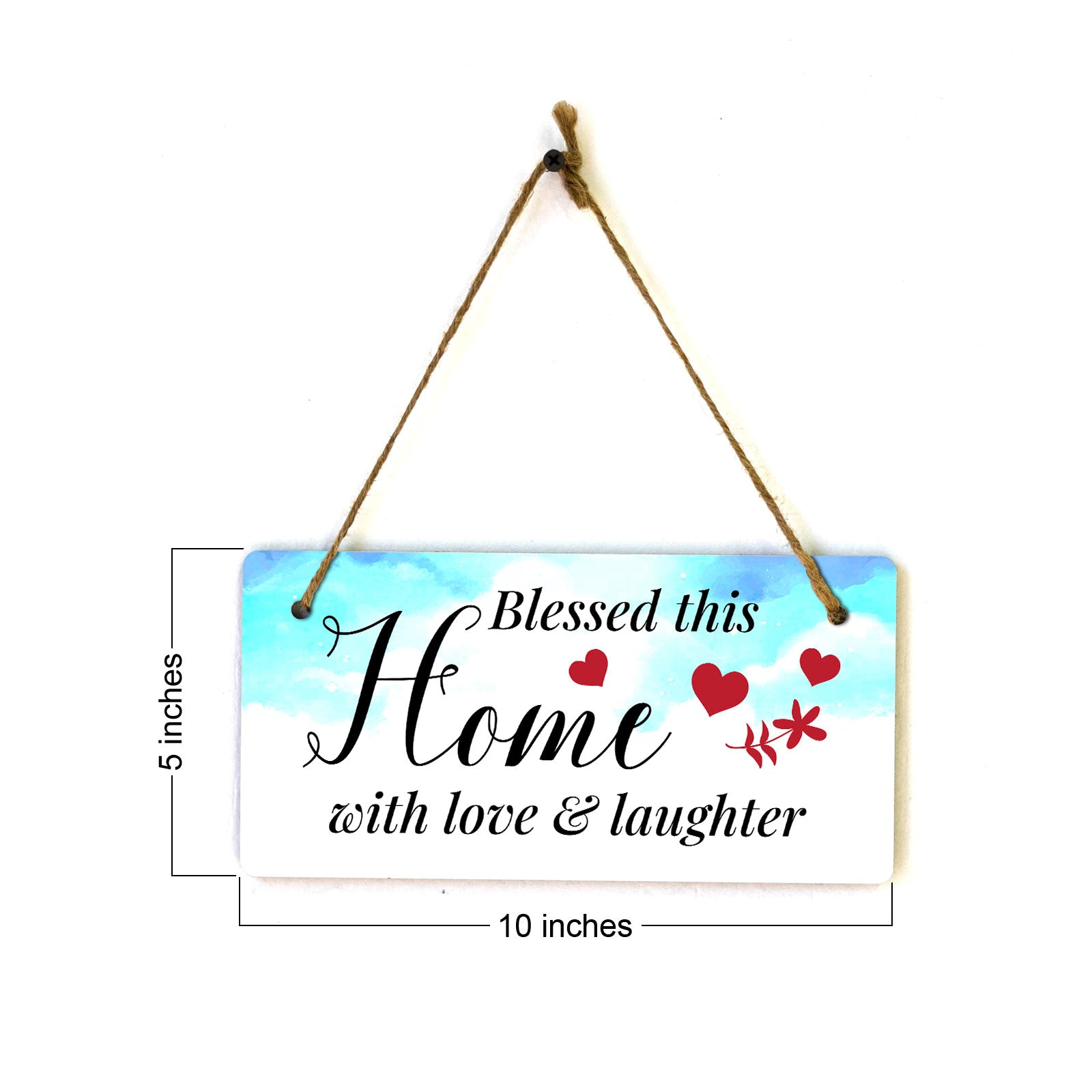 Introducing our versatile and stylish Blessed This Home With Love & Laughter, the perfect blend of style and sophistication to elevate your home or workplace. Our 5x10 Hanging Sign range is the perfect choice for your home, workplace or business. Each sign is attached with rustic twine, providing a charming and versatile accent for any space. Our curated designs effortlessly complement a variety of styles, from rustic farmhouse or Modern Chic, to simple and functional options. Choose from our diverse range of designs to personalize your space. Whether it's a warm welcome at the entrance, a motivational quote for your workspace, or a playful touch for the kids' room, our Hanging Wall or Door Signs are the perfect way to express your unique style.