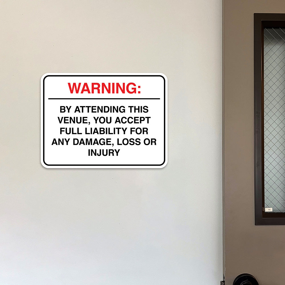 Elevate your business or home environment with Signs ByLITA's premium signs. Our Classic Framed Plus Warning: By Attending This Venue, You Accept Full Liability for Any Damage, Loss or Injury Wall or Door Sign is designed to enhance your workspace with style, while sending a clear message. These signs feature...