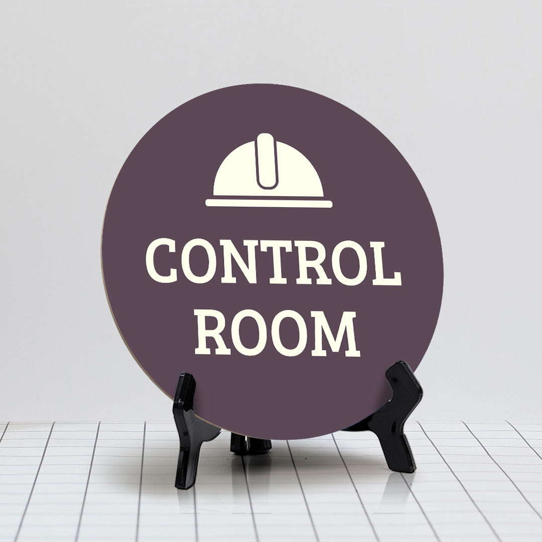Control Room, 5x5 Circle Table Sign. This table sign comes with it's own black acrylic easel, easy to set up and display on any flat surface.
