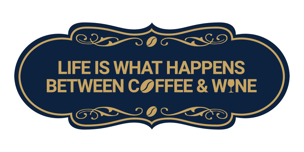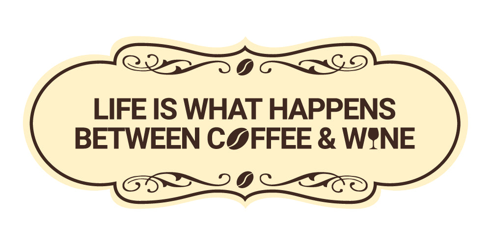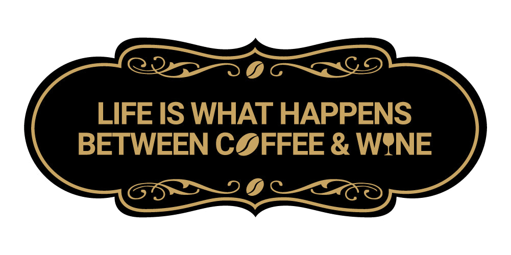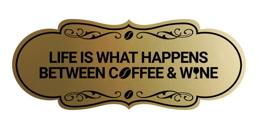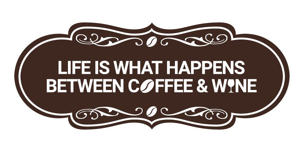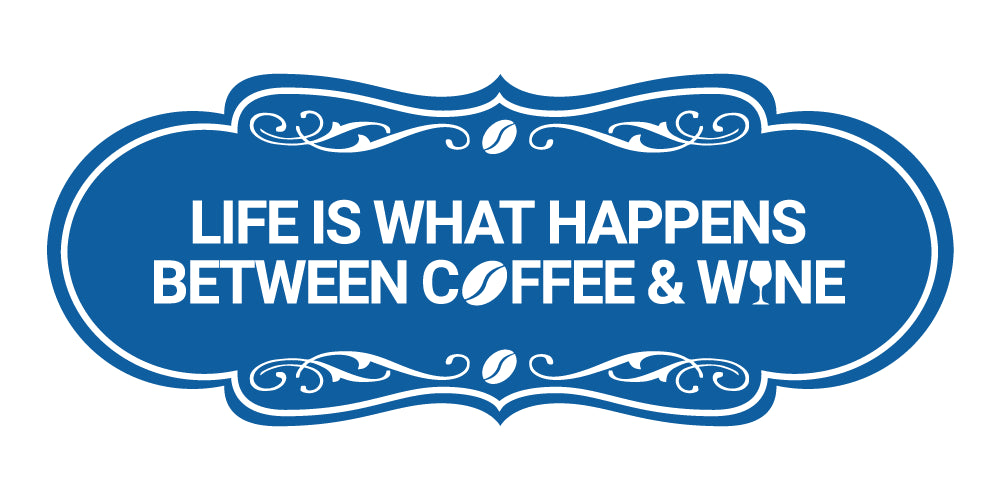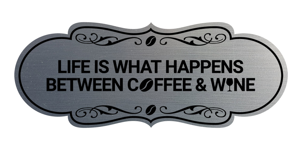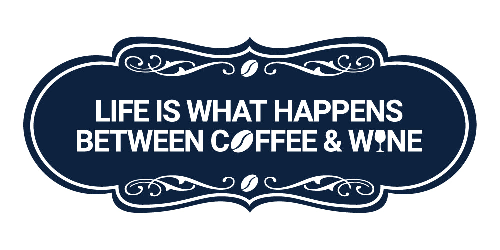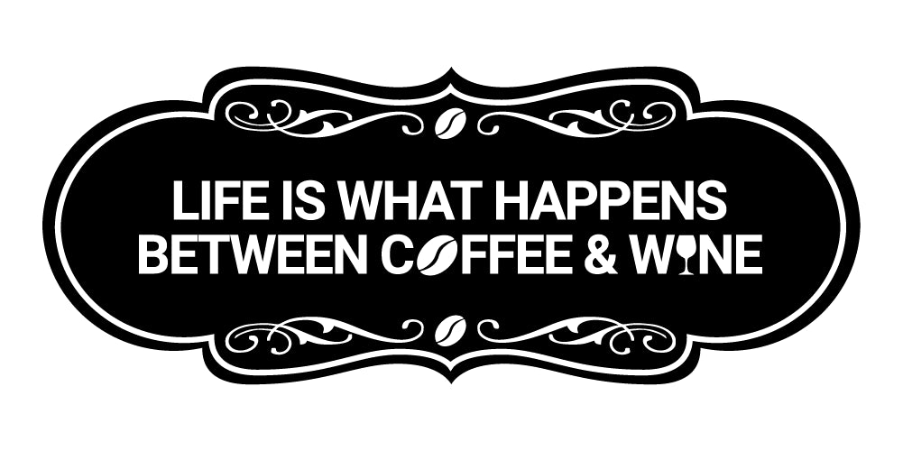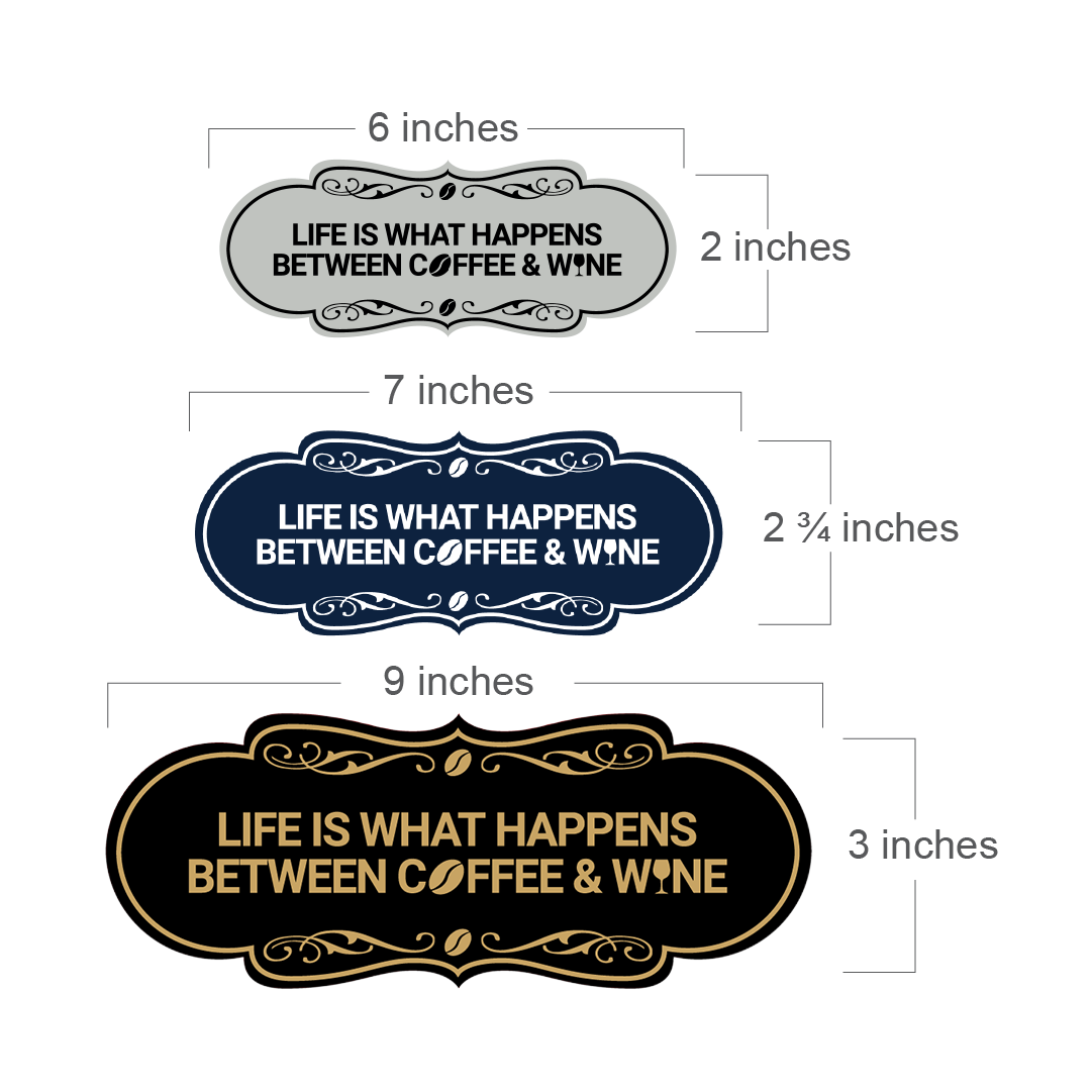 Our Designer Life is What Happens Between Coffee & Wine Sign can be attached to the door, wall or window of your home or business. The sign text and design work is laser engraved into sturdy plastic. Each sign comes with an adhesive foam backing, allowing them to be attached to any flat surface. Comes in multiple colors. Great sign for your kitchen, coffee area or work coffee lounge.