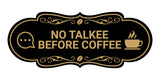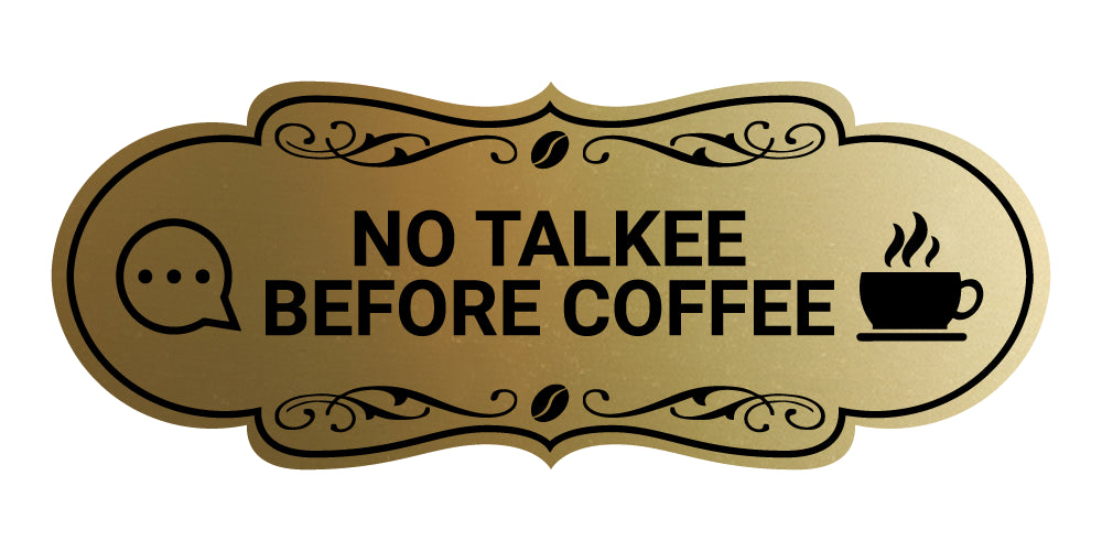 Our Designer No Talkee Before Coffee Sign can be attached to the door, wall or window of your home or business. The sign text and design work is laser engraved into sturdy plastic. Each sign comes with an adhesive foam backing, allowing them to be attached to any flat surface. Comes in multiple colors. Great sign for your kitchen, coffee area or work coffee lounge.