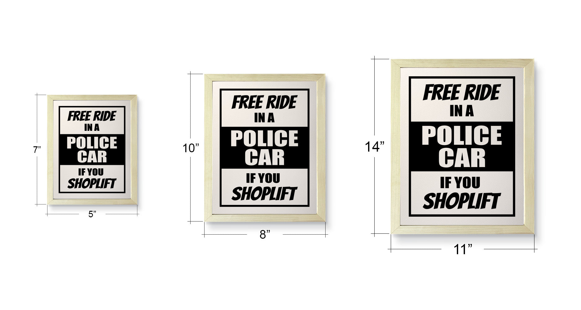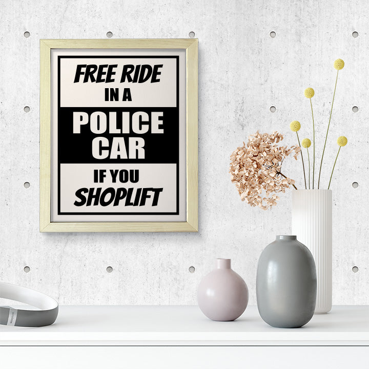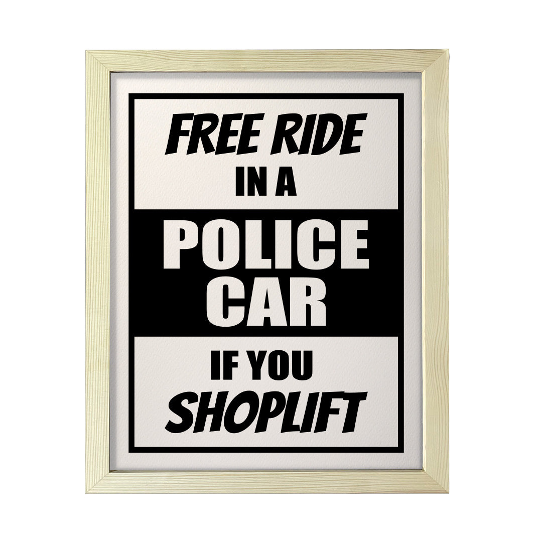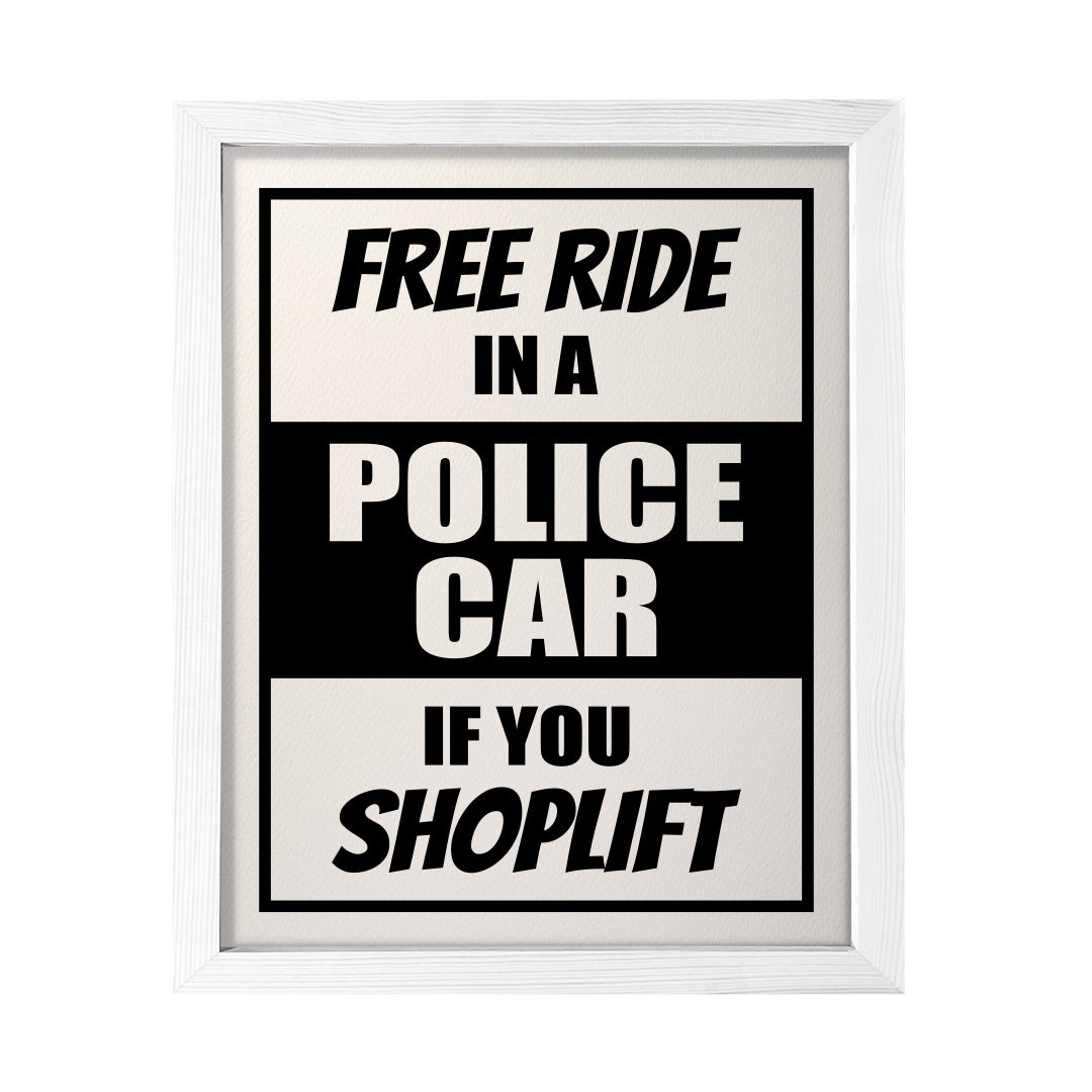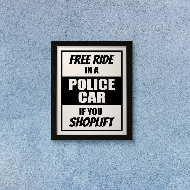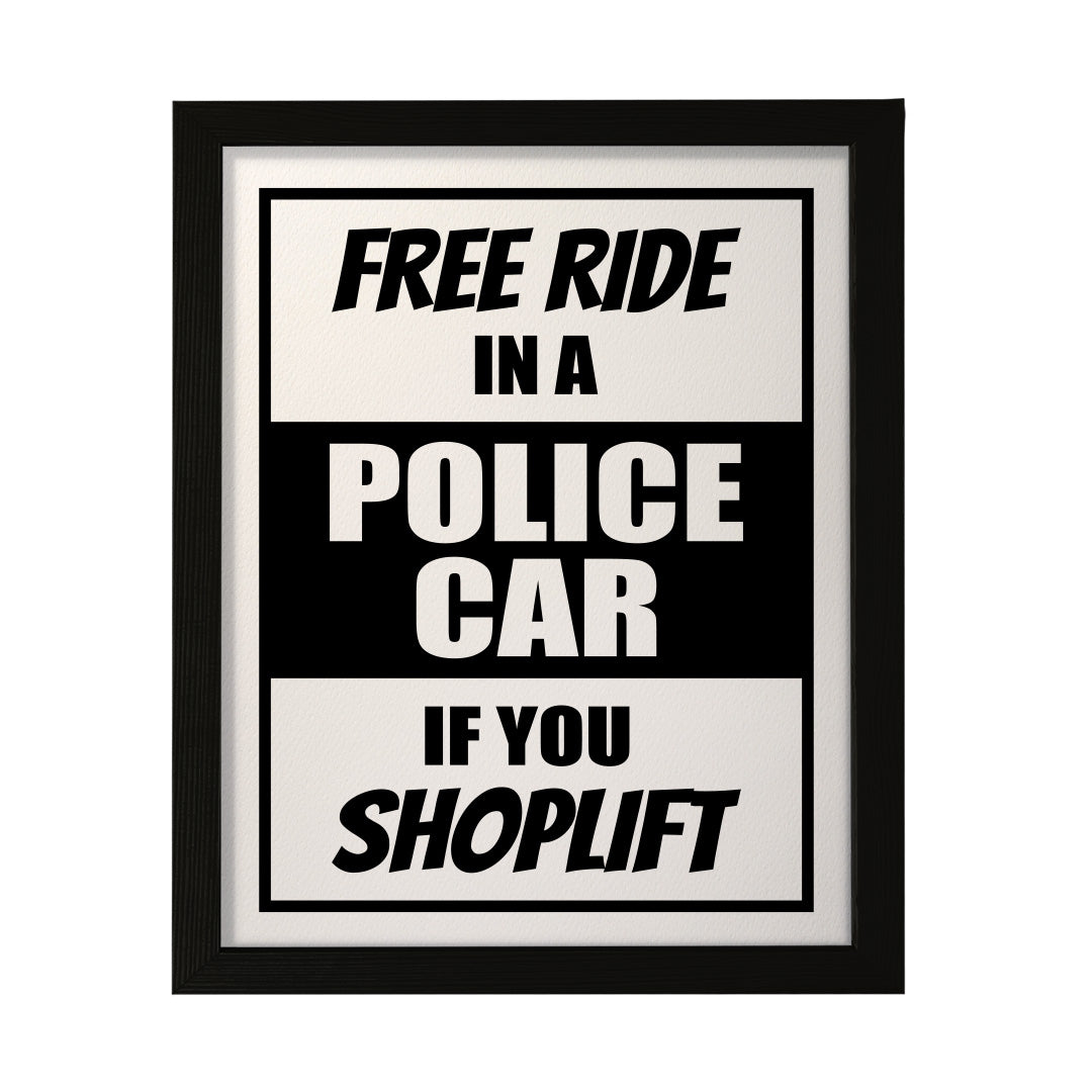 Designs ByLITA Free Ride In A Police Car If You Shoplift, FRAMED Print. Our wall art is available either as a 5" x 7", 8" x 10" or 11" x 14". Printed on 160 GSM high quality card. Comes as an FRAMED print. Easy to hang on any wall. This art is stylish modern decoration for your home and office decoration wall art. Be sure to check out our other designs!