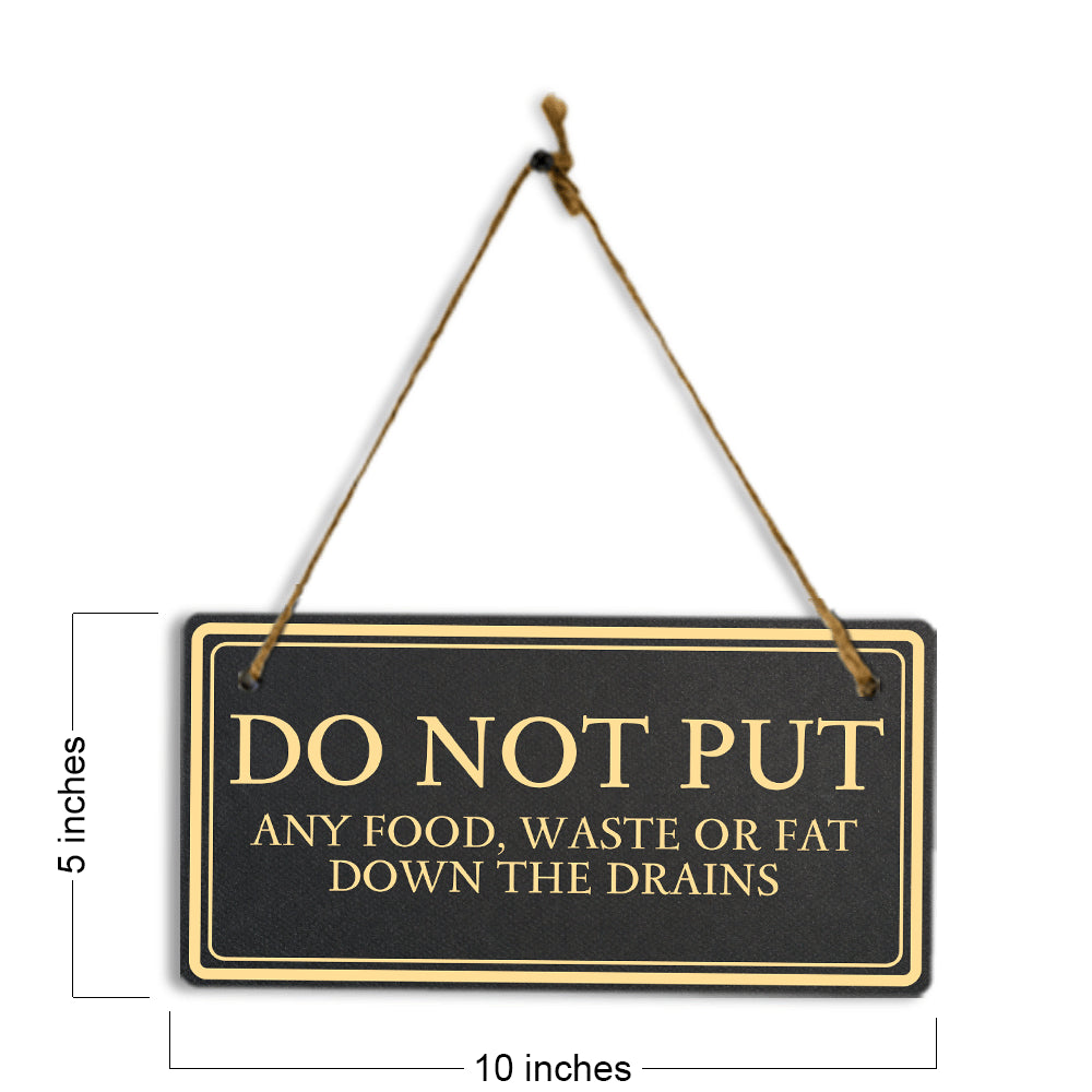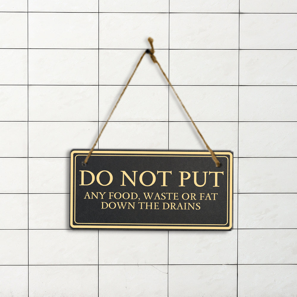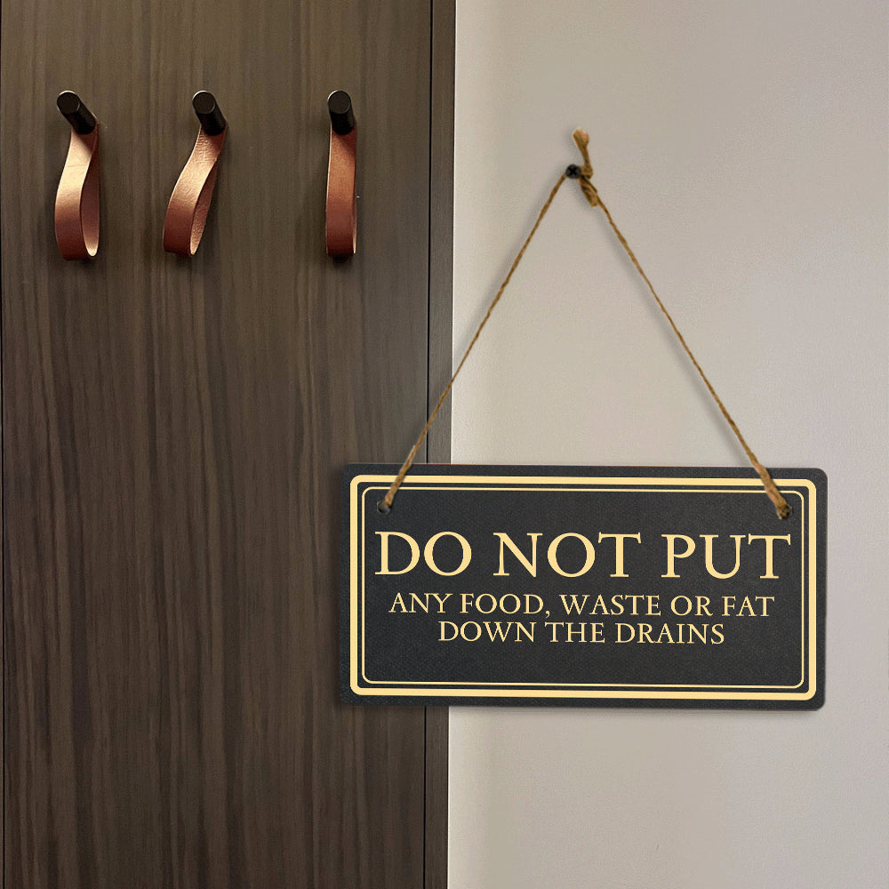 Introducing our versatile and stylish Do Not Put Any Food, Waste or Fat Down The Drains, the perfect blend of style and sophistication to elevate your home or workplace. Our 5x10 Hanging Sign range is the perfect choice for your home, workplace or business. Each sign is attached with rustic twine, providing a charming and versatile accent for any space. Our curated designs effortlessly complement a variety of styles, from rustic farmhouse or Modern Chic, to simple and functional options. Choose from our diverse range of designs to personalize your space. Whether it's a warm welcome at the entrance, a motivational quote for your workspace, or a playful touch for the kids' room, our Hanging Wall or Door Signs are the perfect way to express your unique style.