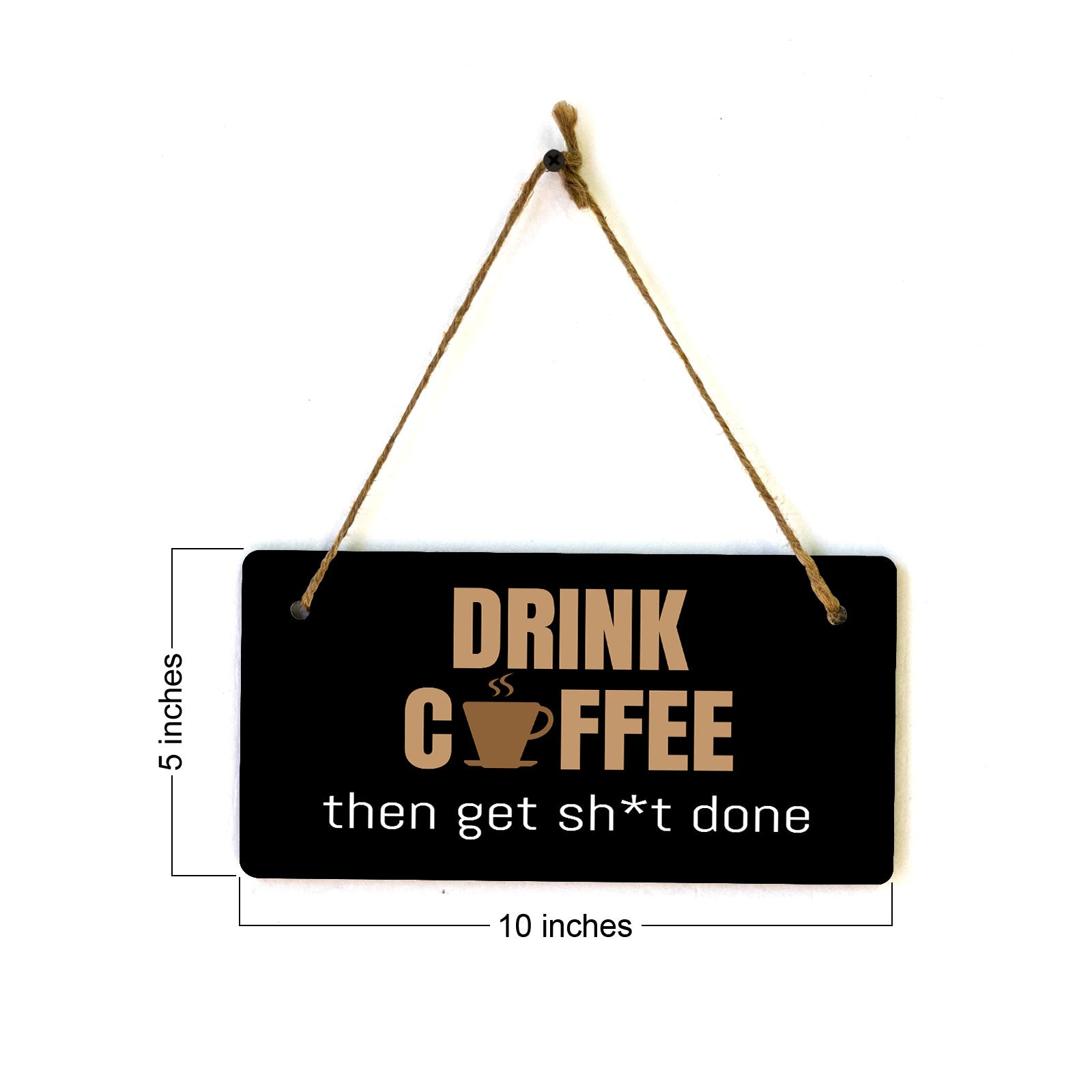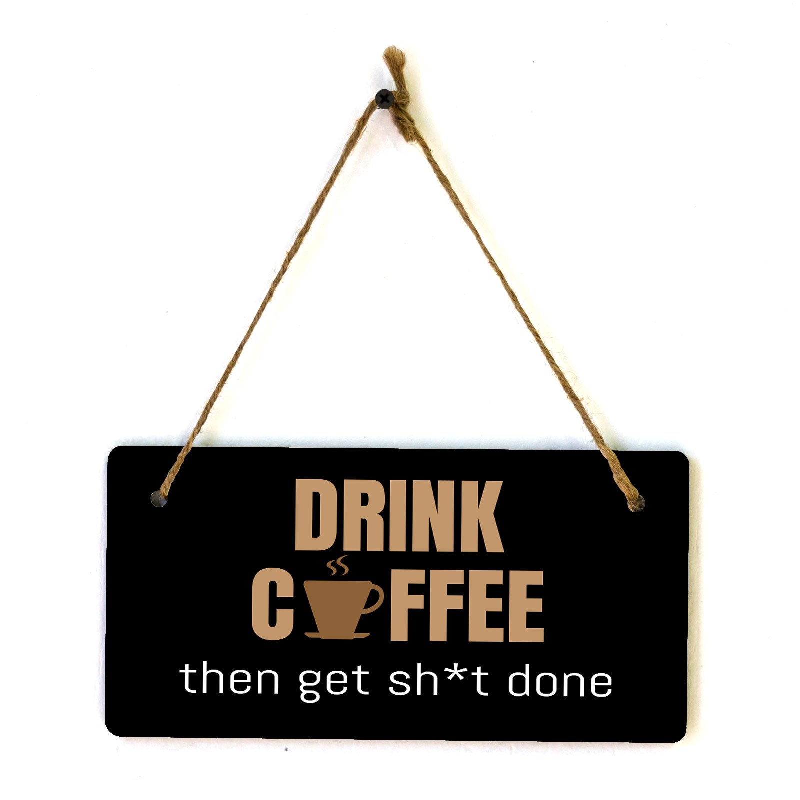 Introducing our versatile and stylish Drink Coffee Then Get Sh*t Done, the perfect blend of style and sophistication to elevate your home or workplace. Our 5x10 Hanging Sign range is the perfect choice for your home, workplace or business. Each sign is attached with rustic twine, providing a charming and versatile accent for any space. Our curated designs effortlessly complement a variety of styles, from rustic farmhouse or Modern Chic, to simple and functional options. Choose from our diverse range of designs to personalize your space. Whether it's a warm welcome at the entrance, a motivational quote for your workspace, or a playful touch for the kids' room, our Hanging Wall or Door Signs are the perfect way to express your unique style.
