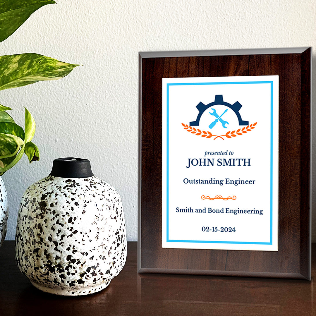 Celebrate the extraordinary achievements and milestones in your life with the Signs ByLITA Custom Engineering and Mechanics Theme Award Plaque. This personalized plaque is the perfect way to honor and commemorate special moments, whether it's recognizing a career accomplishment, academic success, or any other noteworthy event. The Custom Engineering and Mechanics Theme Award Plaque is not just a decoration; it's a heartfelt expression of recognition and appreciation. Commemorate your special moments with a personalized touch that will be cherished for years to come. Whether you're celebrating a colleague's outstanding performance, a loved one's academic excellence, or any remarkable accomplishment, this custom plaque will make the moment unforgettable. Enter the name of the award, the recipient's name, the date and a custom message if you would like. Please double check your typing for what you would like engraved, we engrave exactly as we receive the written custom inputs. If you make an error please cancel your order and re-order with your corrected text.