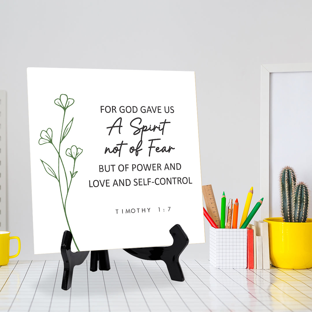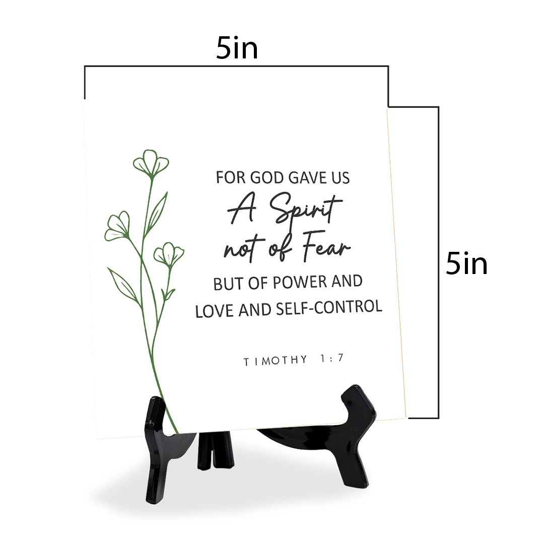 For God Gave Us A Spirit Not Of Fear But Of Power And Love And Self-Control. Timothy 1:7 5"x 5" Square Table Sign With Acrylic Easel