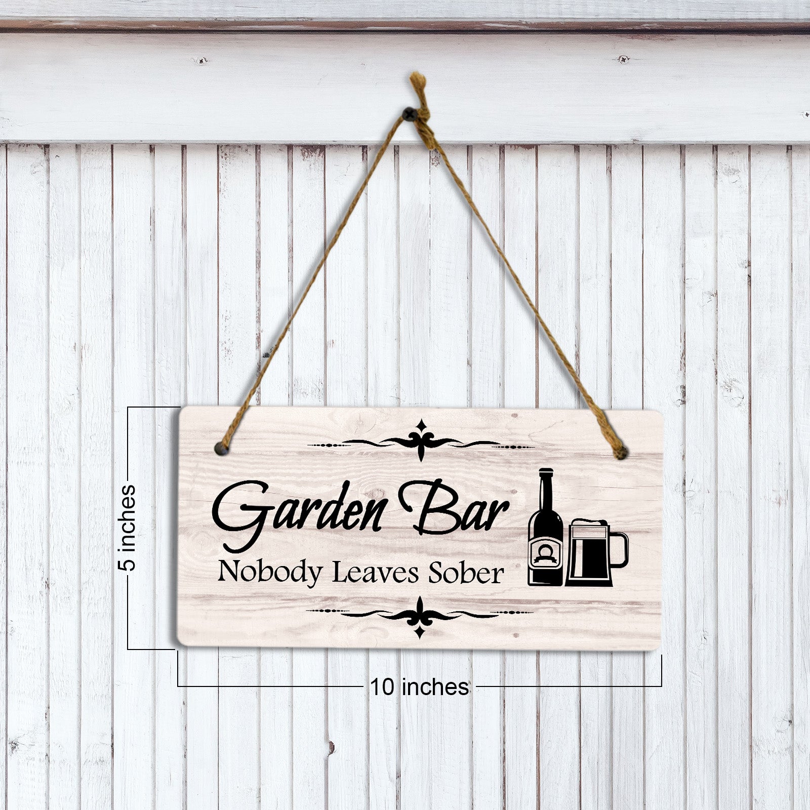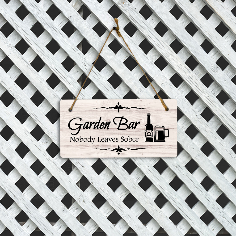Introducing our versatile and stylish Garden Bar Nobody Leaves Sober, the perfect blend of style and sophistication to elevate your home or workplace. Our 5x10 Hanging Sign range is the perfect choice for your home, workplace or business. Each sign is attached with rustic twine, providing a charming and versatile accent for any space. Our curated designs effortlessly complement a variety of styles, from rustic farmhouse or Modern Chic, to simple and functional options. Choose from our diverse range of designs to personalize your space. Whether it's a warm welcome at the entrance, a motivational quote for your workspace, or a playful touch for the kids' room, our Hanging Wall or Door Signs are the perfect way to express your unique style.