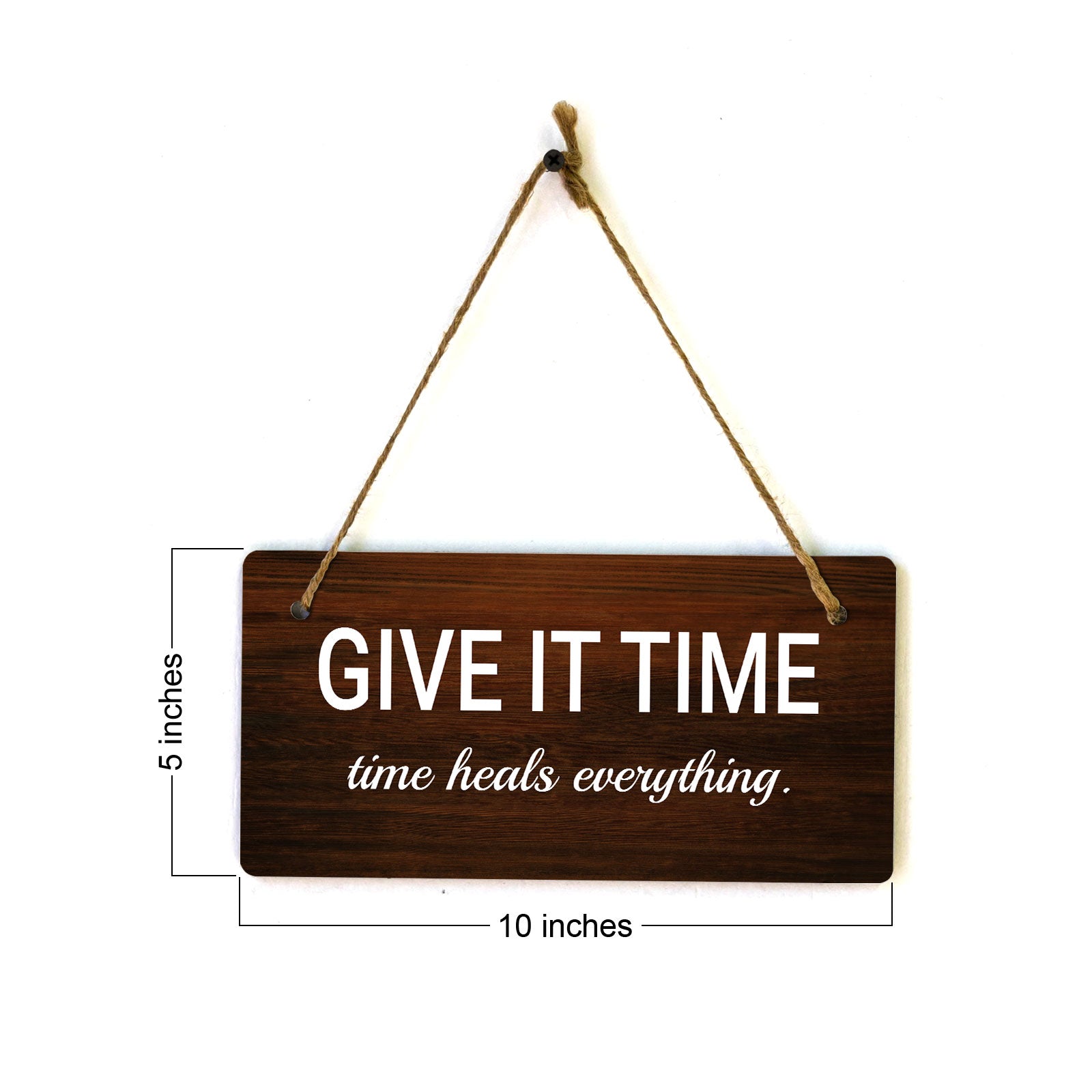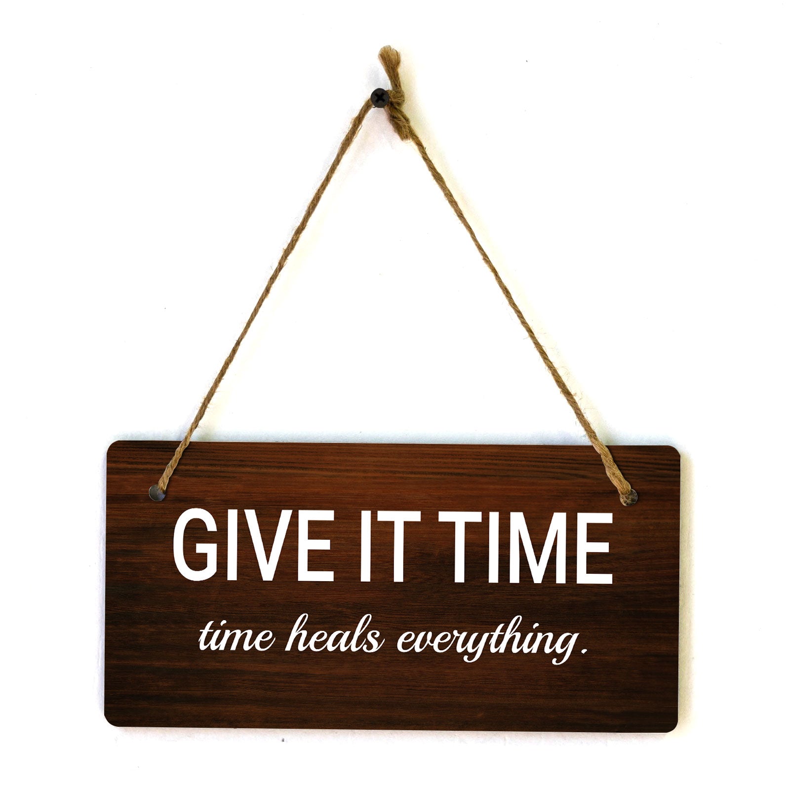 Introducing our versatile and stylish Give It Time Time Heals Everything., the perfect blend of style and sophistication to elevate your home or workplace. Our 5x10 Hanging Sign range is the perfect choice for your home, workplace or business. Each sign is attached with rustic twine, providing a charming and versatile accent for any space. Our curated designs effortlessly complement a variety of styles, from rustic farmhouse or Modern Chic, to simple and functional options. Choose from our diverse range of designs to personalize your space. Whether it's a warm welcome at the entrance, a motivational quote for your workspace, or a playful touch for the kids' room, our Hanging Wall or Door Signs are the perfect way to express your unique style.
