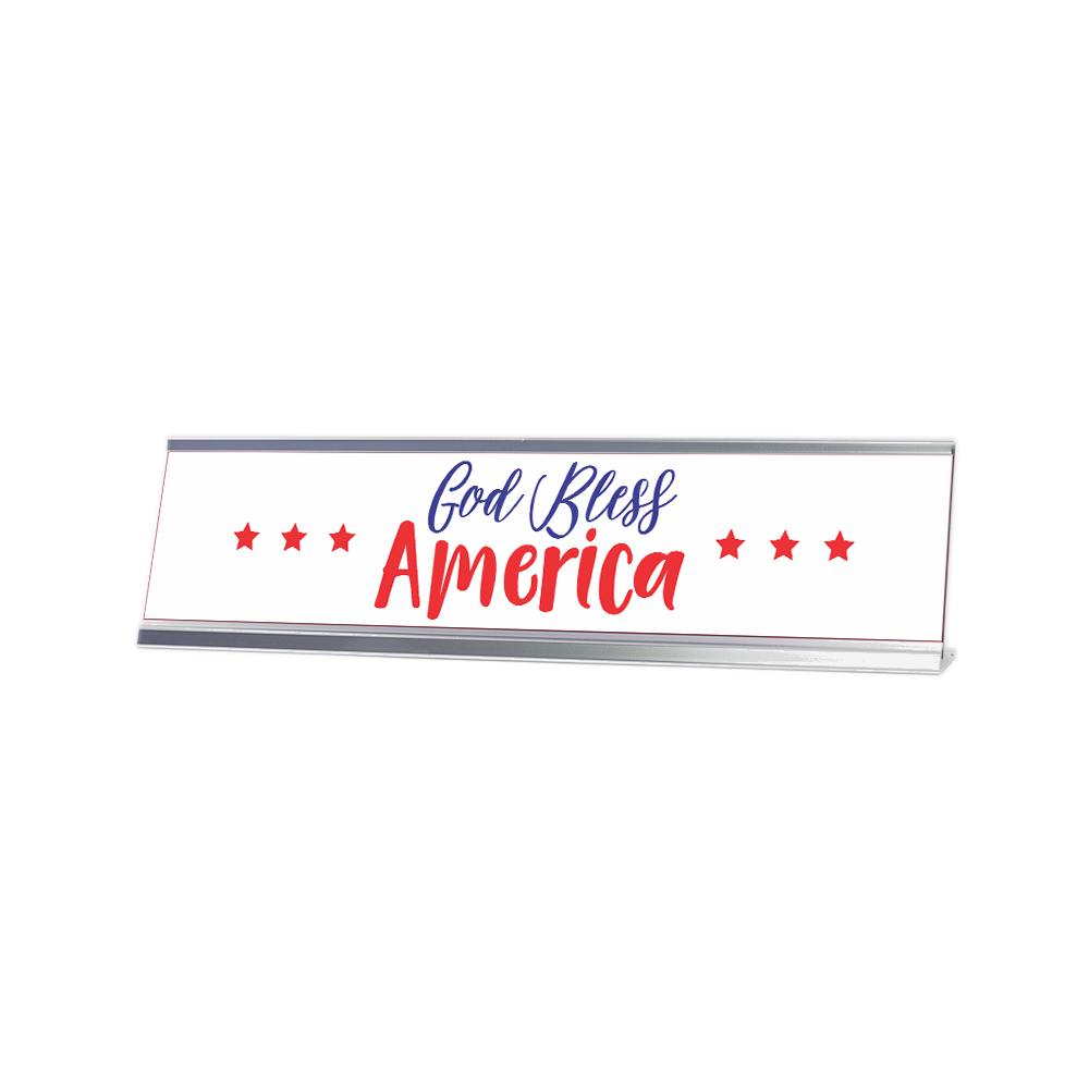 Signs ByLITA Novelty Desk Sign Nameplate "God Bless America". Add a touch of patriotic pride to your office space with our 2 x 10" Desk Sign Patriotic Office Decor. Whether you're a veteran, government worker, or simply want to showcase your love for your country, this desk sign is the perfect addition. The premium sublimated plastic nameplate comes with a sturdy colored aluminium frame. Ideal for both personal use or as a thoughtful gift for colleagues, this desk sign embodies American spirit and professionalism.