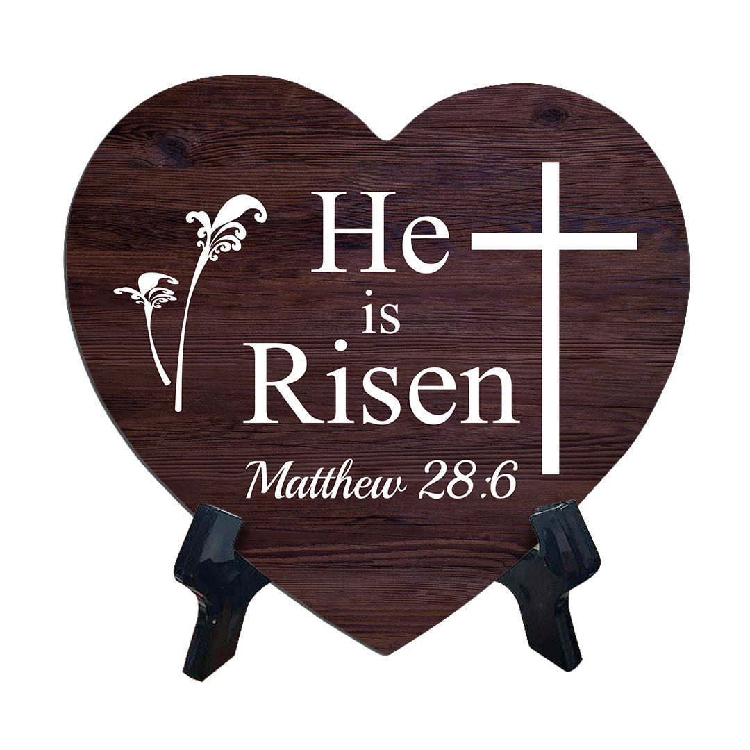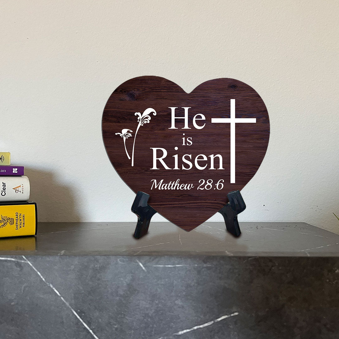 He Is Risen Matthew 28:6, 6x5 Heart Table Sign. This table sign comes with it's own black acrylic easel, easy to set up and display on any flat surface.