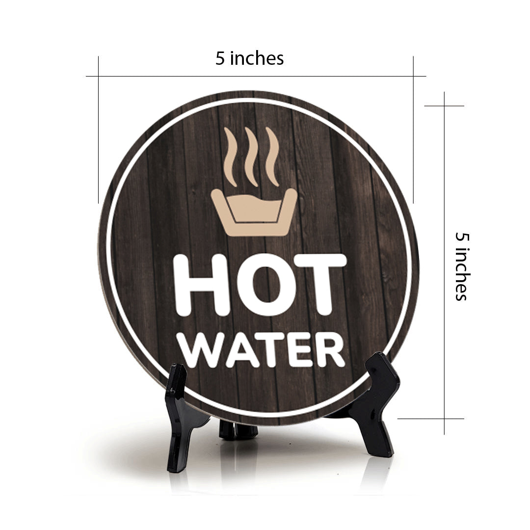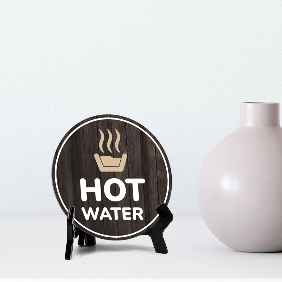 Hot Water, 5x5 Circle Table Sign. This table sign comes with it's own black acrylic easel, easy to set up and display on any flat surface.