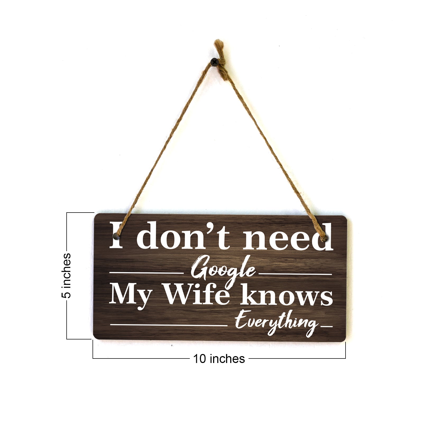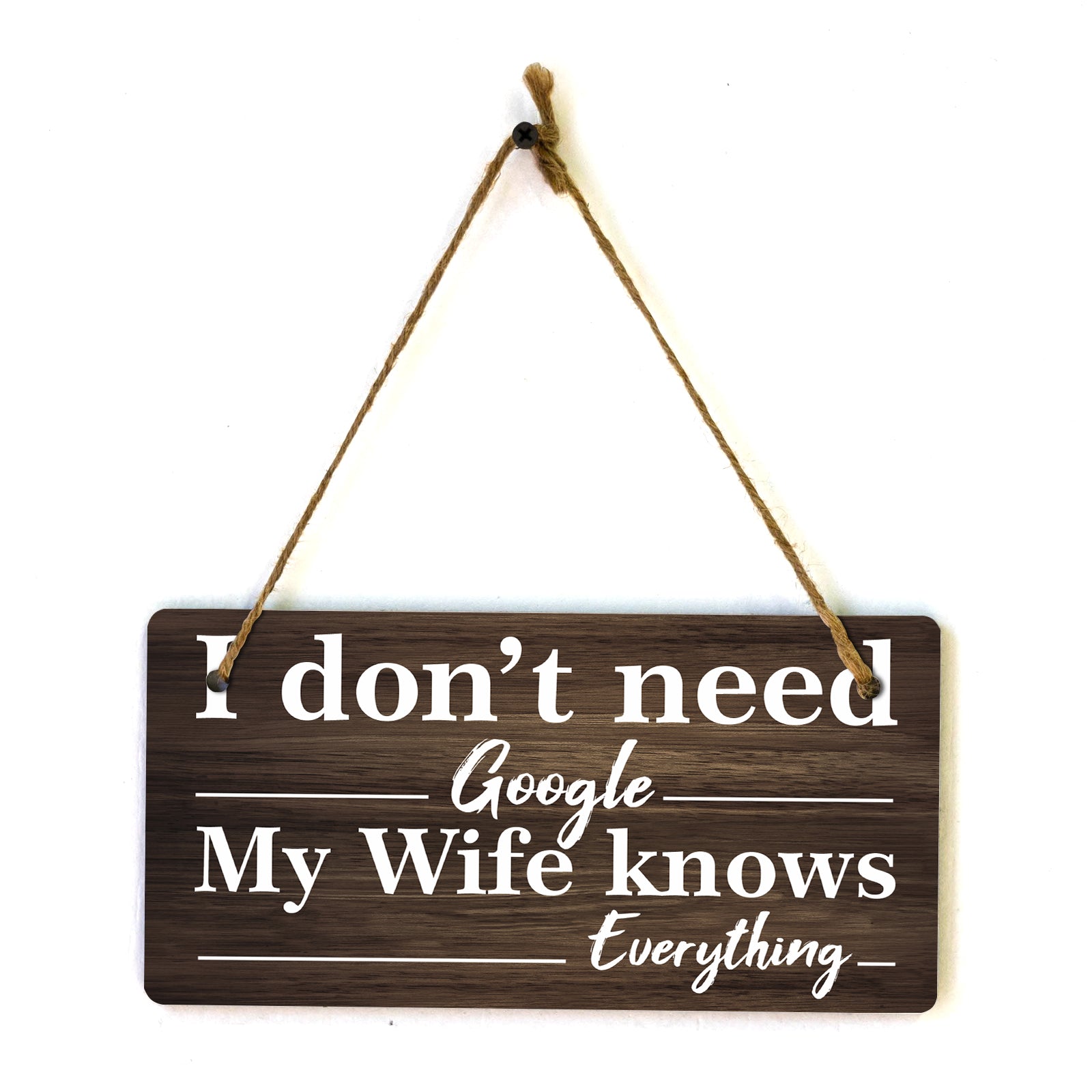Introducing our versatile and stylish I Don't Need Google My Wife Knows Everything, the perfect blend of style and sophistication to elevate your home or workplace. Our 5x10 Hanging Sign range is the perfect choice for your home, workplace or business. Each sign is attached with rustic twine, providing a charming and versatile accent for any space. Our curated designs effortlessly complement a variety of styles, from rustic farmhouse or Modern Chic, to simple and functional options. Choose from our diverse range of designs to personalize your space. Whether it's a warm welcome at the entrance, a motivational quote for your workspace, or a playful touch for the kids' room, our Hanging Wall or Door Signs are the perfect way to express your unique style.