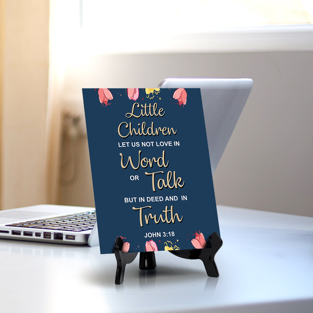 Little Children let us not love in word or talk but in deed and in truth John 3:18 6 x 8" Table Sign With Acrylic Easel