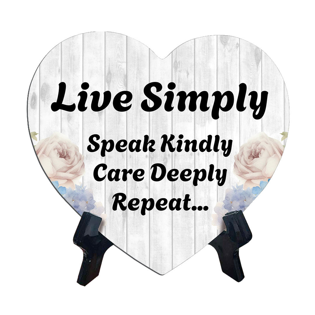 Live Simply Speak Kindly Care Deeply Repeat..., 6x5 Heart Table Sign. This table sign comes with it's own black acrylic easel, easy to set up and display on any flat surface.
