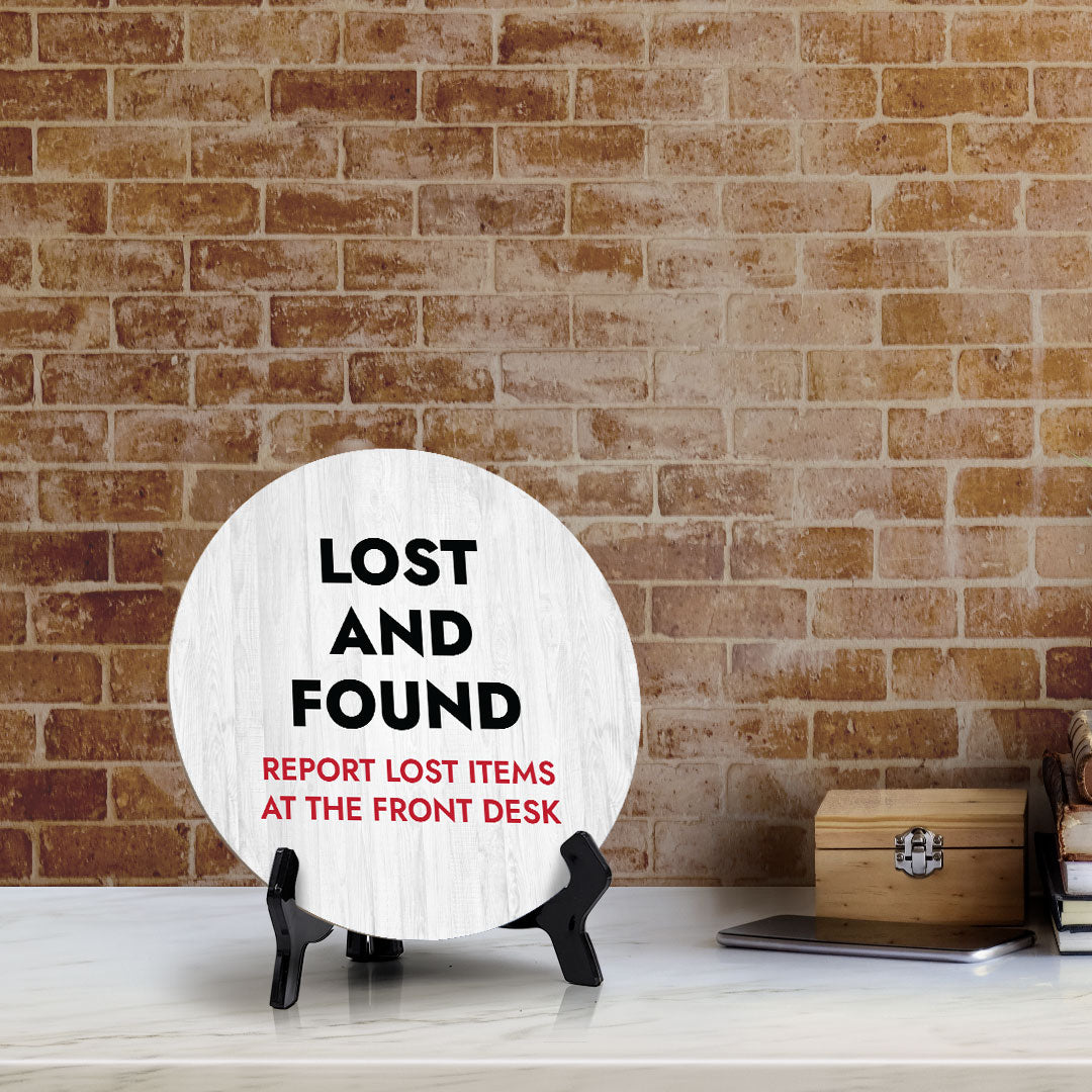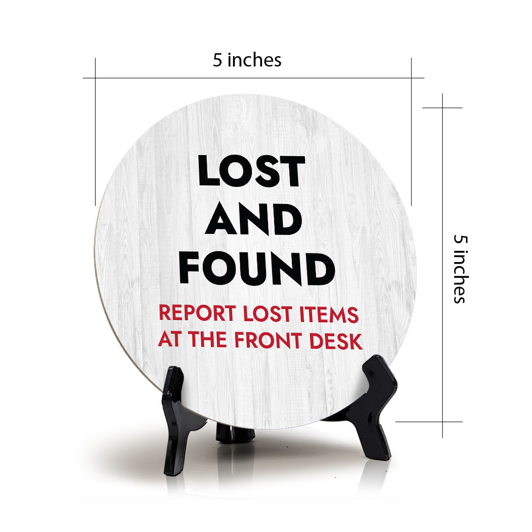Lost and Found Report Lost Items At The Front Desk Circle Table Sign with Acrylic Stand (5x5")