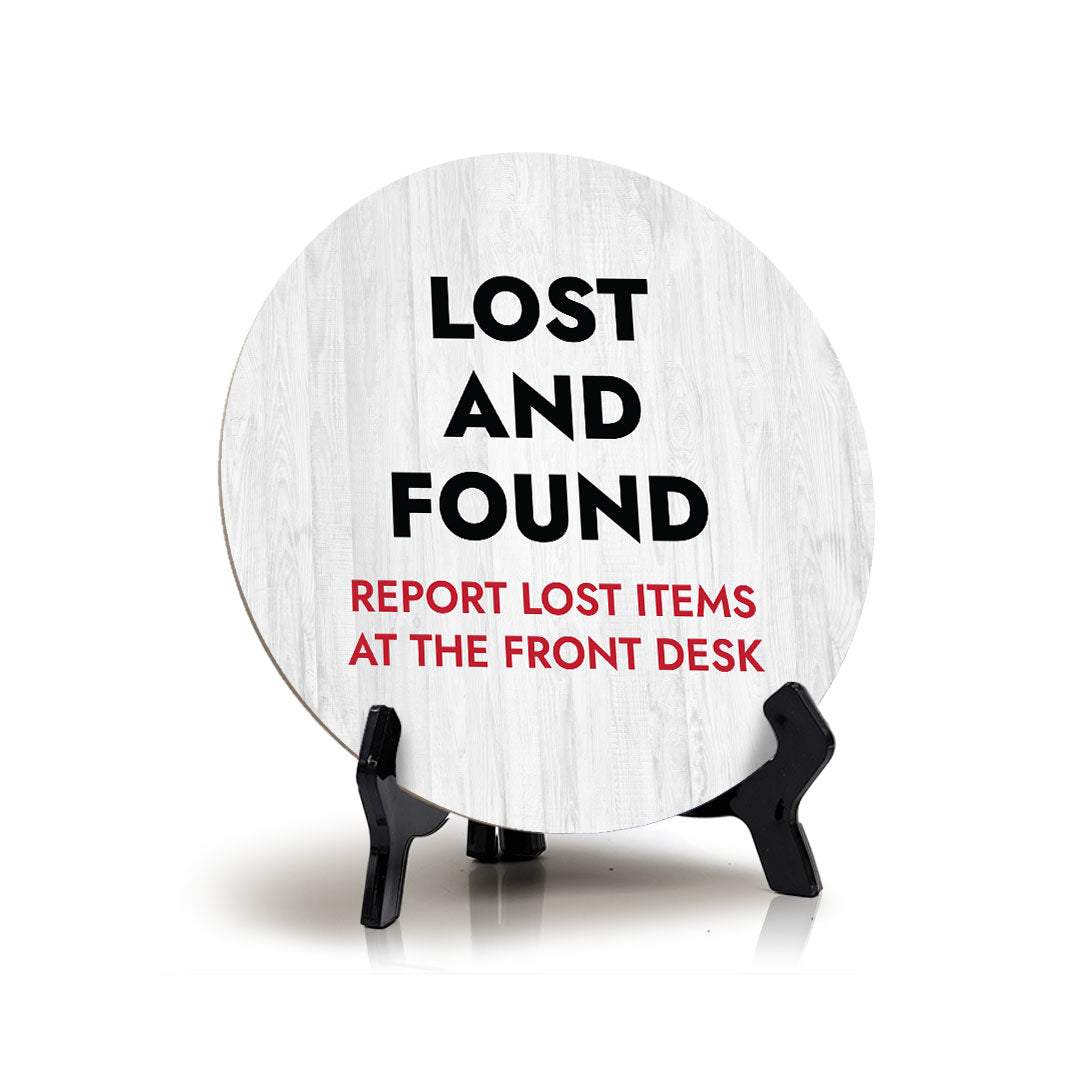 Lost and Found Report Lost Items At The Front Desk, 5x5 Circle Table Sign. This table sign comes with it's own black acrylic easel, easy to set up and display on any flat surface.