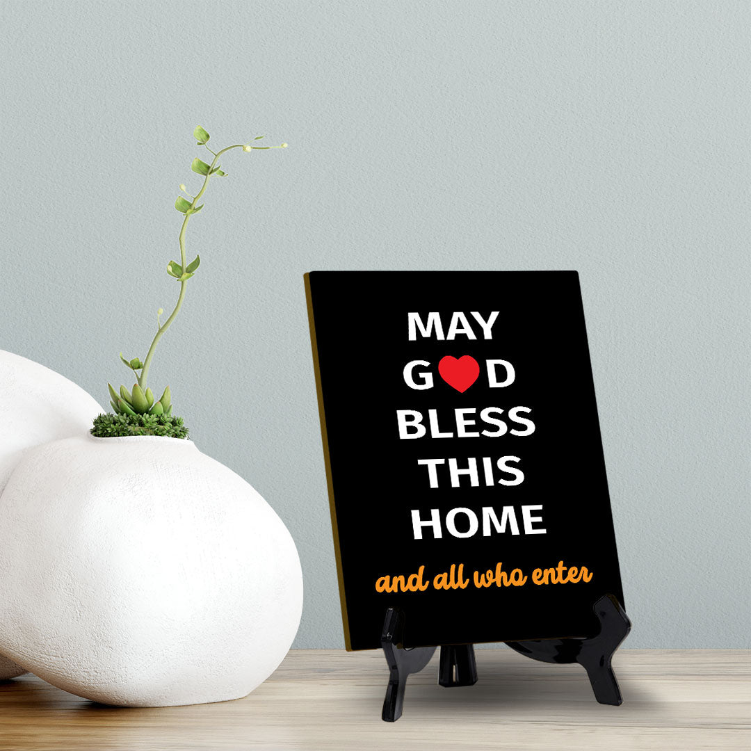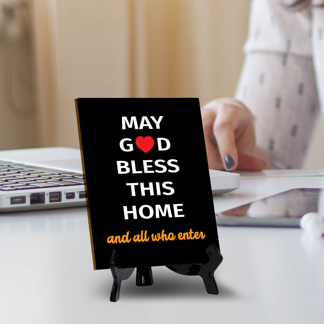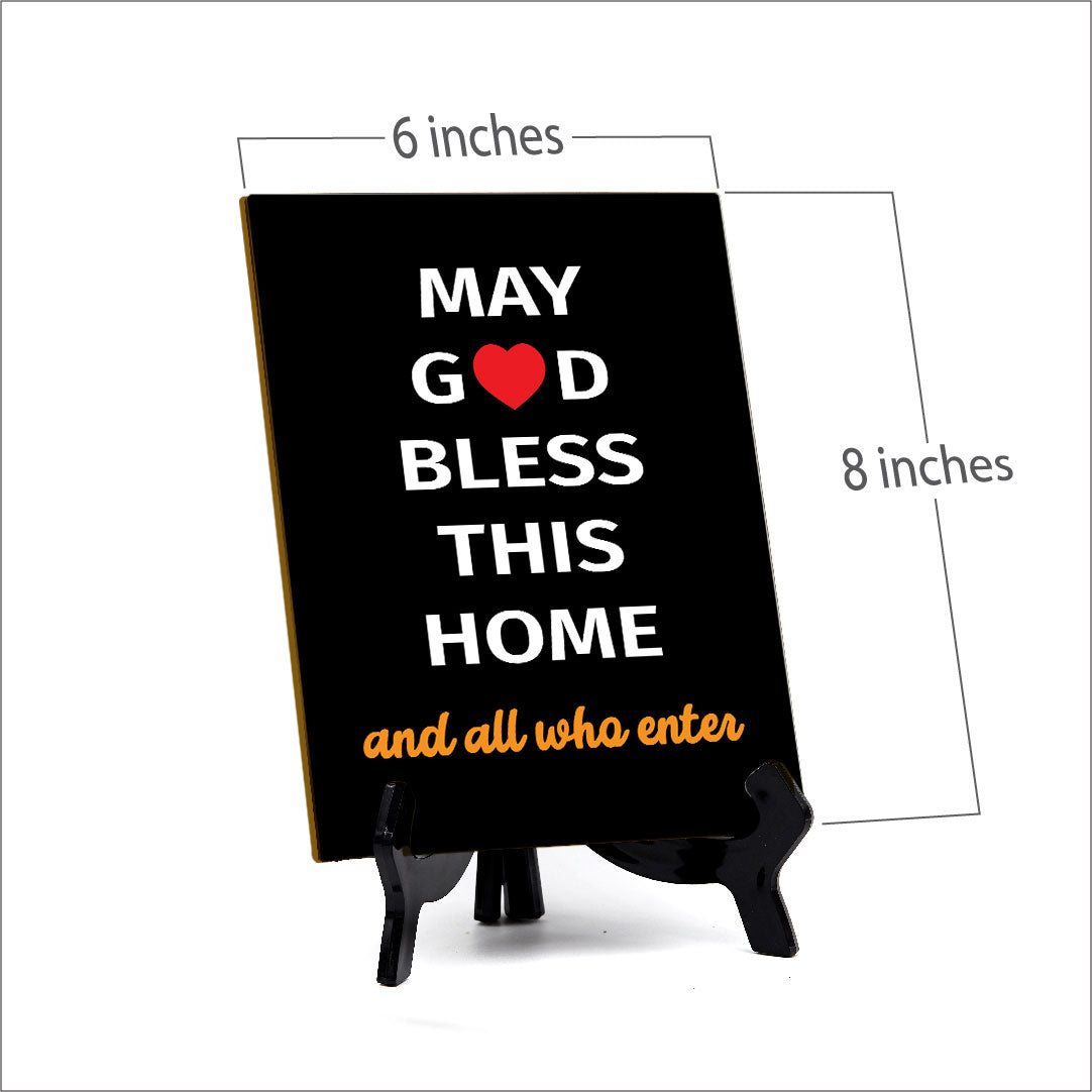 May God Bless This Home And All Who Enter, 6X8 Table Sign. This table sign comes with it's own black acrylic easel, easy to set up and display on any flat surface.