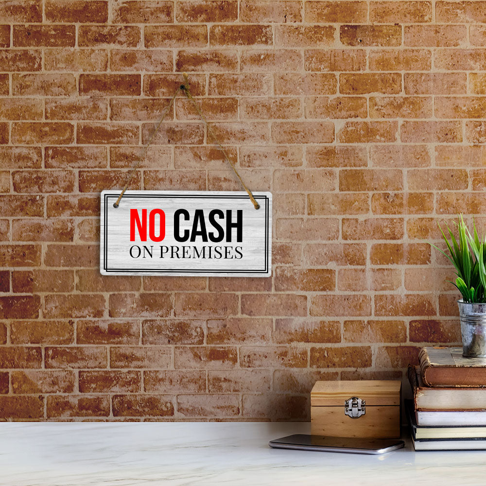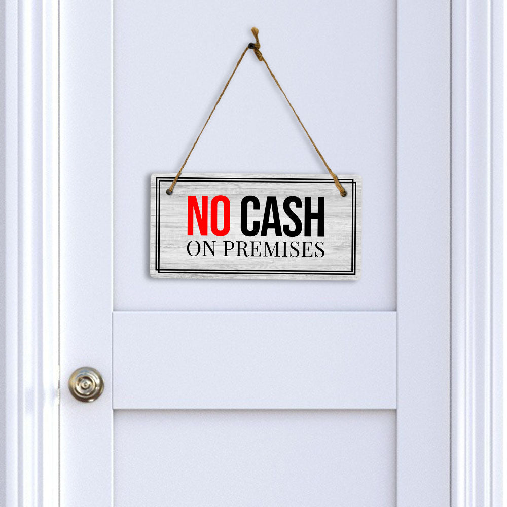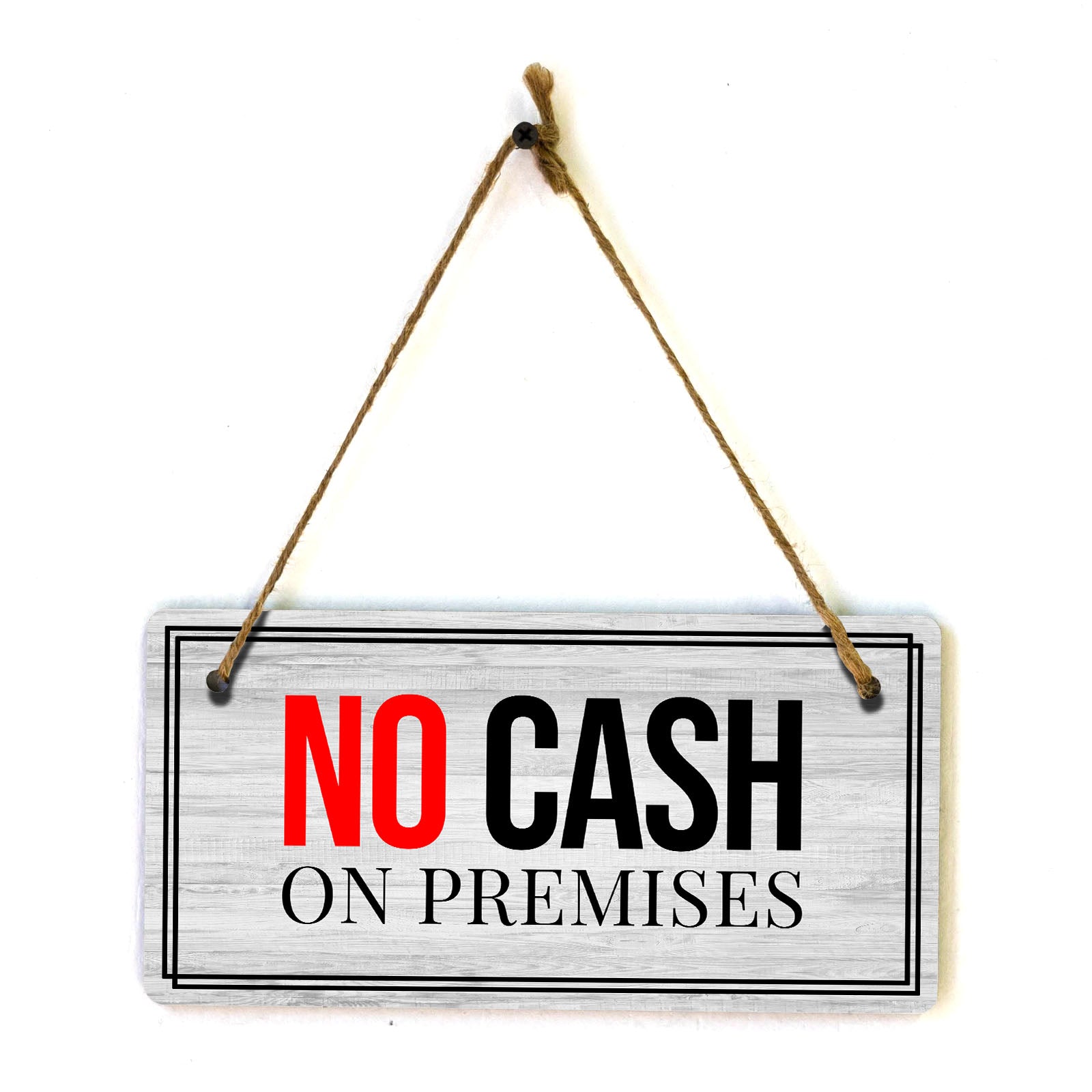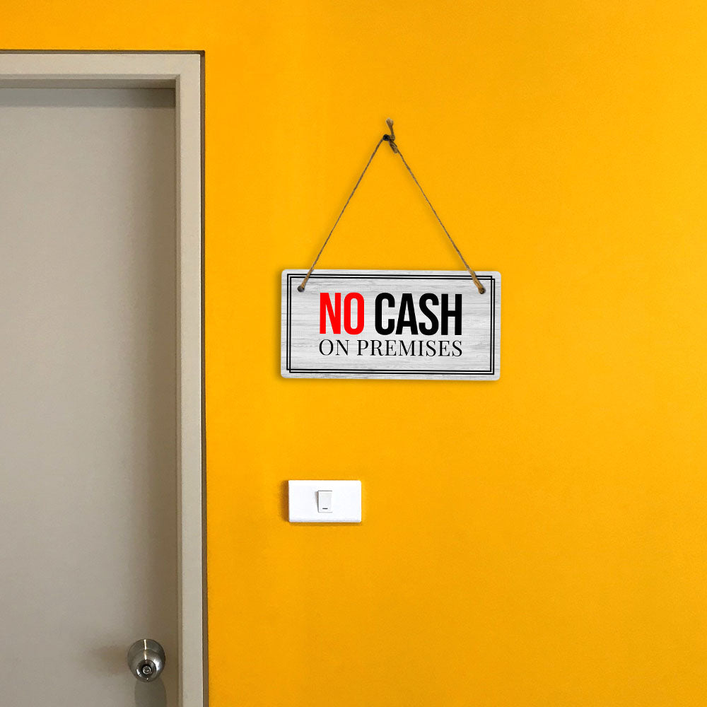 Introducing our versatile and stylish No Cash On Premises, the perfect blend of style and sophistication to elevate your home or workplace. Our 5x10 Hanging Sign range is the perfect choice for your home, workplace or business. Each sign is attached with rustic twine, providing a charming and versatile accent for any space. Our curated designs effortlessly complement a variety of styles, from rustic farmhouse or Modern Chic, to simple and functional options. Choose from our diverse range of designs to personalize your space. Whether it's a warm welcome at the entrance, a motivational quote for your workspace, or a playful touch for the kids' room, our Hanging Wall or Door Signs are the perfect way to express your unique style.