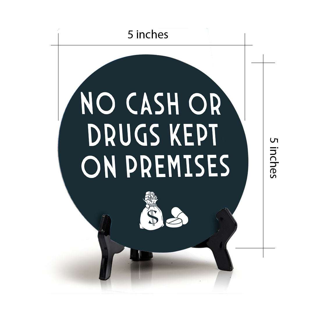 No Cash or Drugs Kept On Premises, 5x5 Circle Table Sign. This table sign comes with it's own black acrylic easel, easy to set up and display on any flat surface.