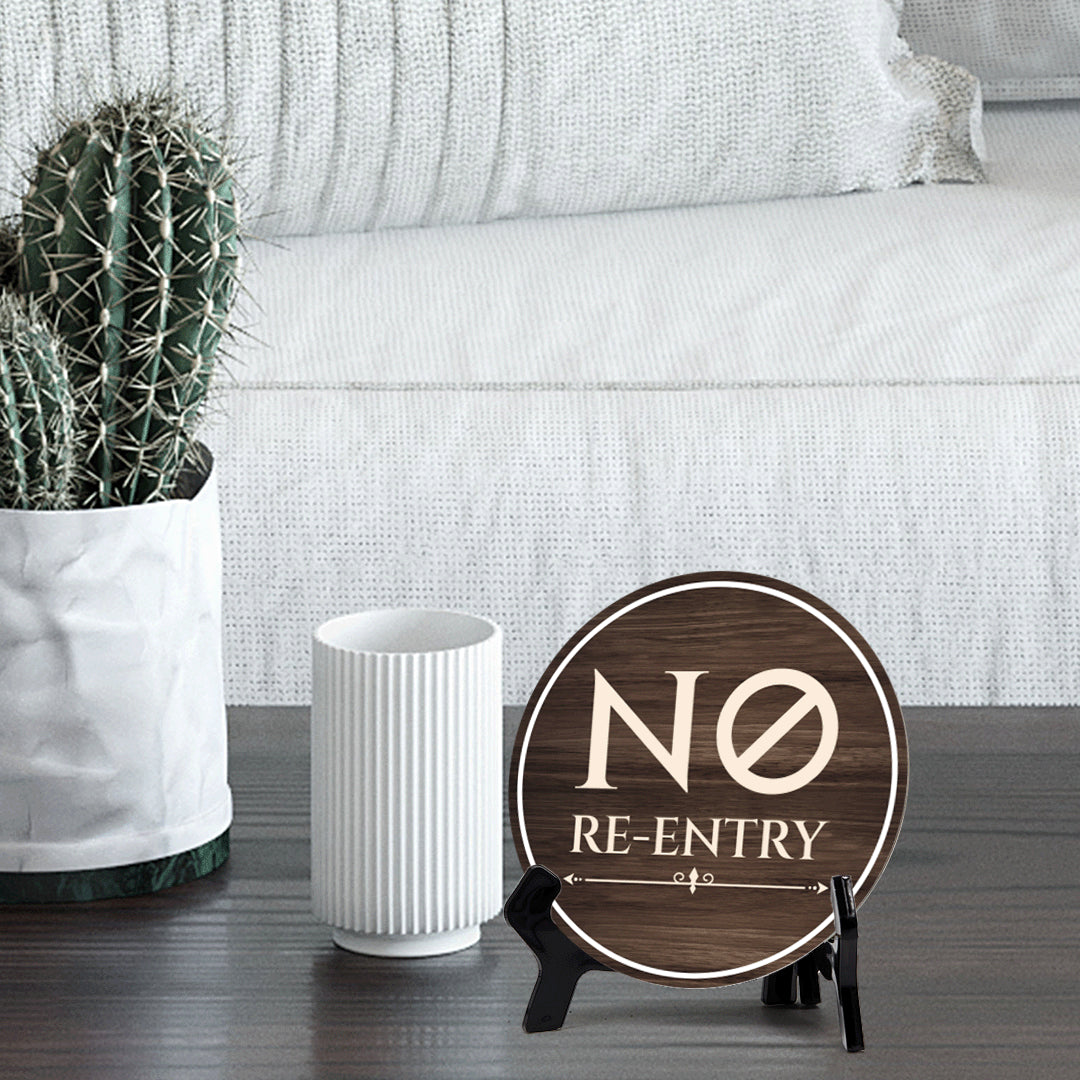 No Re-Entry, 5x5 Circle Table Sign. This table sign comes with it's own black acrylic easel, easy to set up and display on any flat surface.