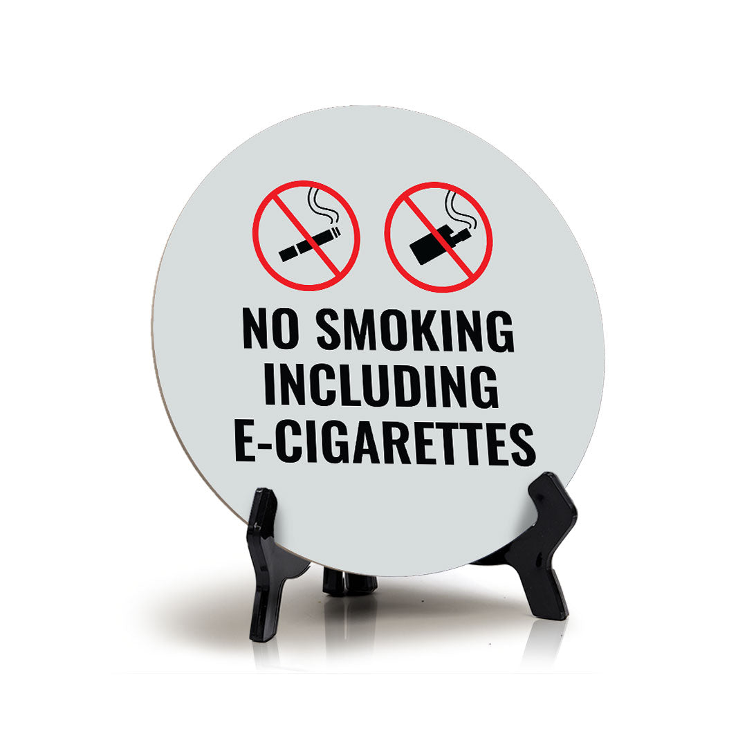 No Smoking Including E-Cigarettes, 5x5 Circle Table Sign. This table sign comes with it's own black acrylic easel, easy to set up and display on any flat surface.