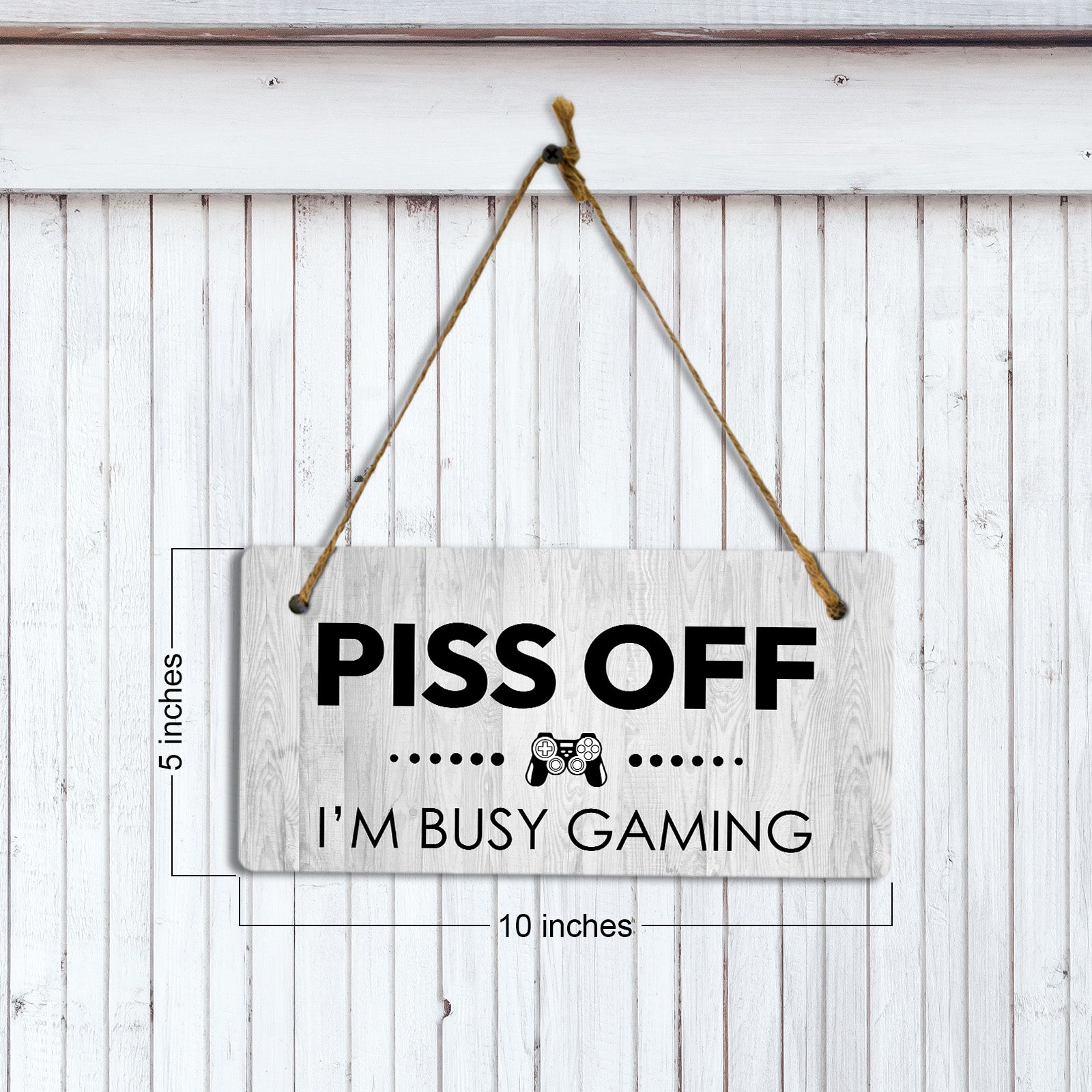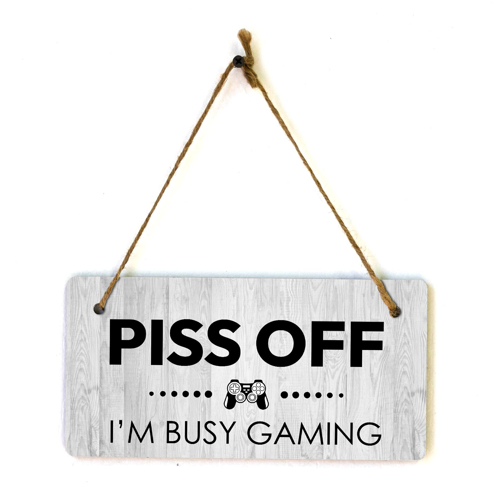 Introducing our versatile and stylish Piss Off I'm Busy Gaming, the perfect blend of style and sophistication to elevate your home or workplace. Our 5x10 Hanging Sign range is the perfect choice for your home, workplace or business. Each sign is attached with rustic twine, providing a charming and versatile accent for any space. Our curated designs effortlessly complement a variety of styles, from rustic farmhouse or Modern Chic, to simple and functional options. Choose from our diverse range of designs to personalize your space. Whether it's a warm welcome at the entrance, a motivational quote for your workspace, or a playful touch for the kids' room, our Hanging Wall or Door Signs are the perfect way to express your unique style.
