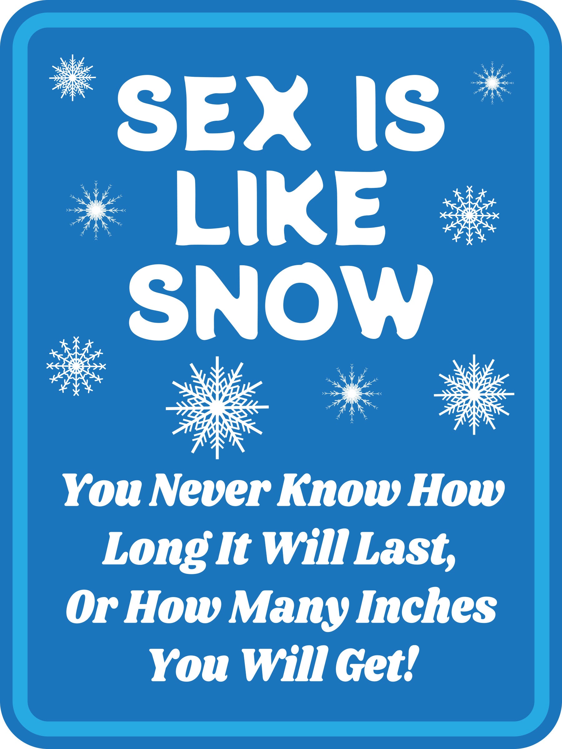 Elevate your business or home environment with Signs ByLITA's premium signs. Our Portrait Round Plus Sex Is Like Snow You Never Know How Long It Will Last, Or How Many Inches You Will Get! Wall or Door Sign is designed to enhance your workspace with style, while sending a clear message. These signs feature vivid sublimation printing that ensures clear and lasting colors, making a powerful visual impact. Installation is a breeze with double-sided adhesive foam tape, providing a secure hold without surface damage. Crafted from durable reinforced plastic, our Portrait Round Plus Sex Is Like Snow You Never Know How Long It Will Last, Or How Many Inches You Will Get! Wall or Door Sign is built to withstand daily wear and environmental conditions, eliminating the need for frequent replacements. These versatile signs find applications in various settings, from office doors and meeting rooms to displaying essential information or adding a touch of sophistication to your home decor. Signs ByLITA are the ideal choice for corporate offices, medical facilities, schools, and more. Our Sex Is Like Snow You Never Know How Long It Will Last, Or How Many Inches You Will Get! Sign offers a practical and stylish solution to elevate your workspace. Invest in these signs today to make a lasting impression, enhance professionalism, safety and security and transform your workspace into a welcoming and professional environment.