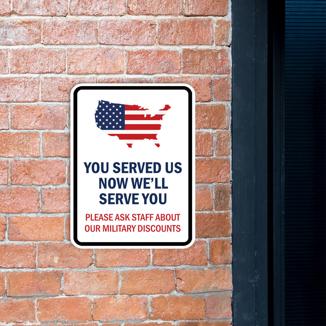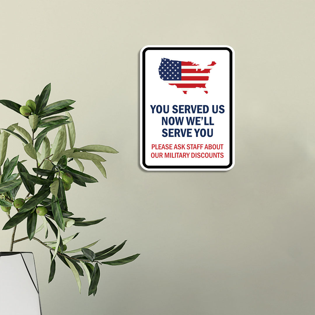 Elevate your business or home environment with Signs ByLITA's premium signs. Our Portrait Round Plus You Served Us Now We'll Serve You Please Ask Staff About Our Military Discounts Wall or Door Sign is designed to enhance your workspace with style, while sending a clear message. These signs feature vivid...