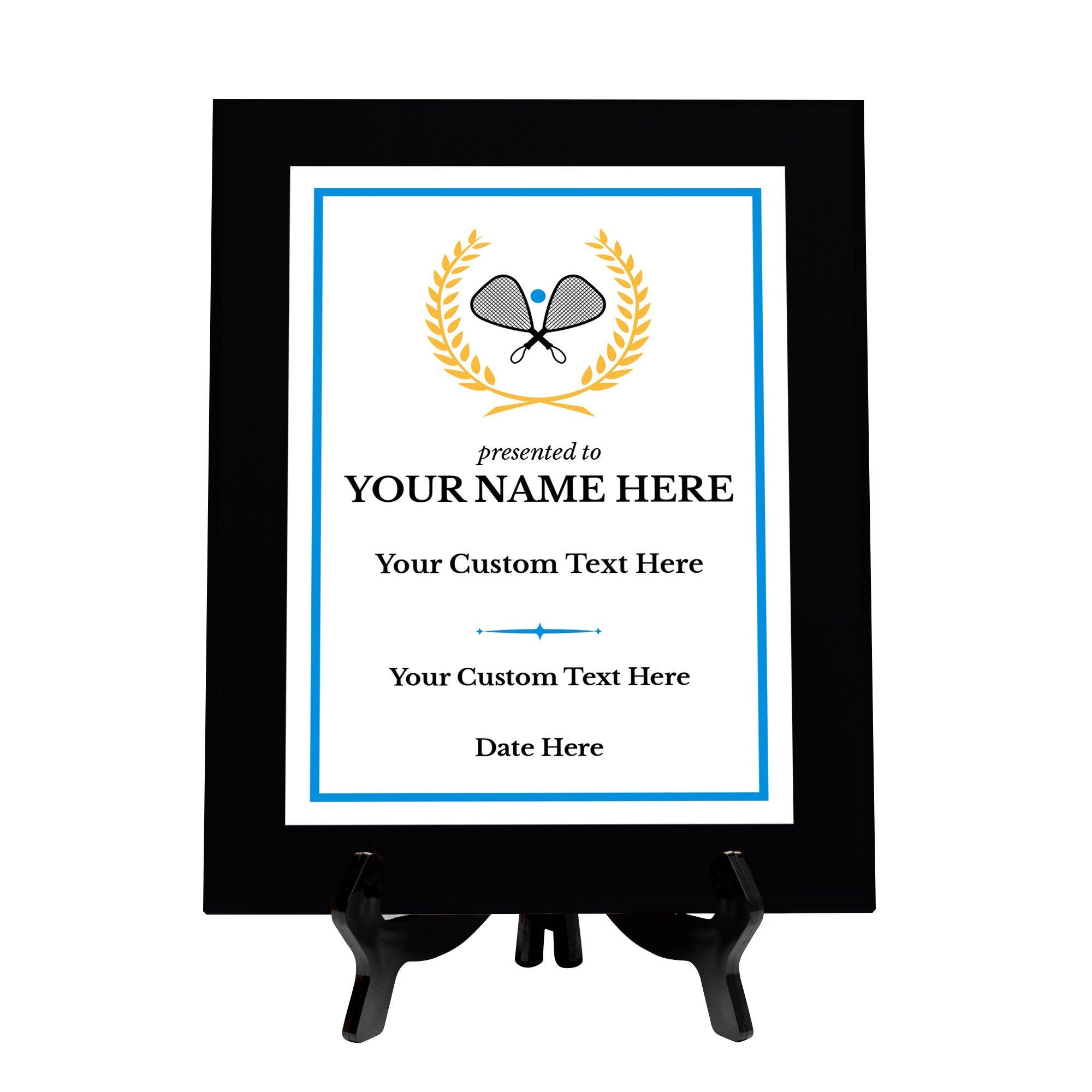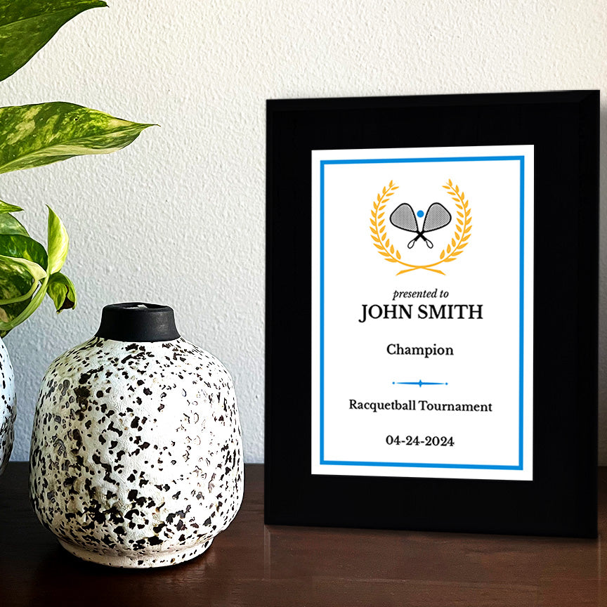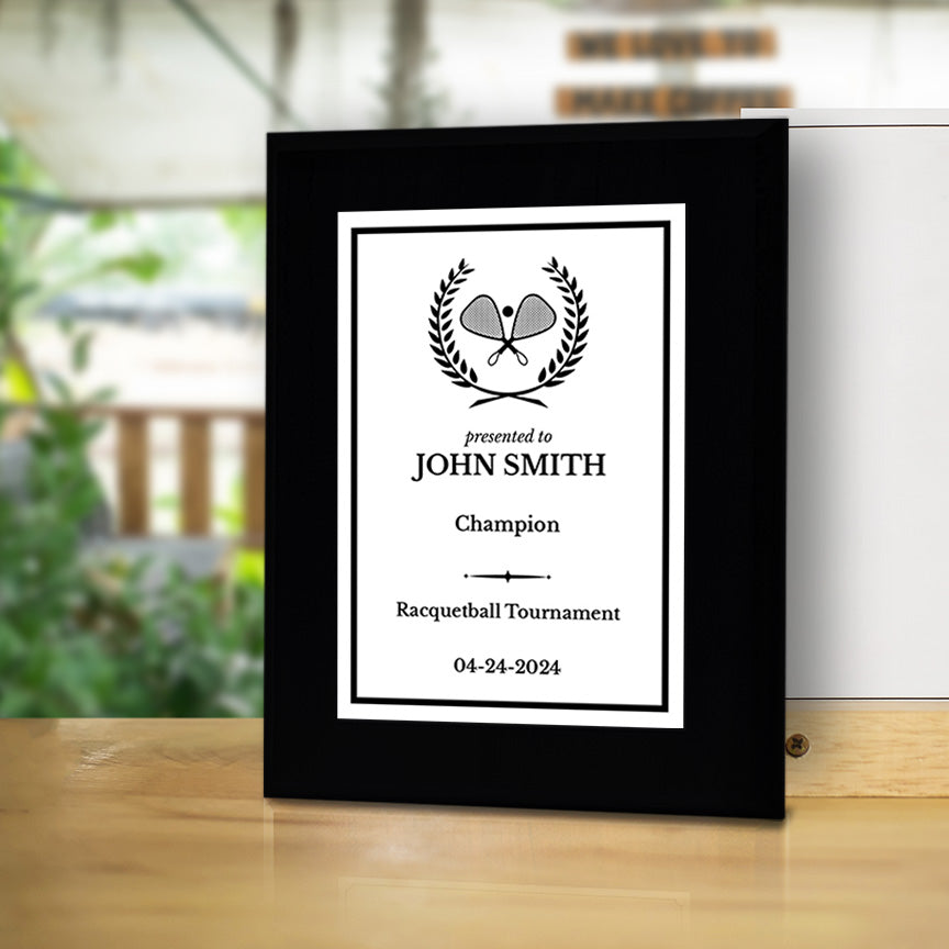 Celebrate an extraordinary achievement or milestone with the Signs ByLITA Custom Racquetball Award Plaque. Our personalized plaques are the perfect way to honor and commemorate special moments, whether it's recognizing a career accomplishment, sport success, or any other noteworthy event. This Racquetball Customizable Wooden Award Plaque is not just a decoration; it's a heartfelt expression of recognition and appreciation. Commemorate your special moments with a personalized touch that will be cherished for years to come. With three sizes and over 20 fonts to choose from, you can create the ideal personalized keepsake for any occasion. Our plaques come shrink-wrapped for added protection and with precut keyhole slots on the back for wall mounting. For a more versatile display option, choose our stylish black easel. Please double check that your text is correct and has no typos. We will make your plaque exactly as we receive the written custom inputs. If you make an error please cancel your order and re-order with your corrected text.