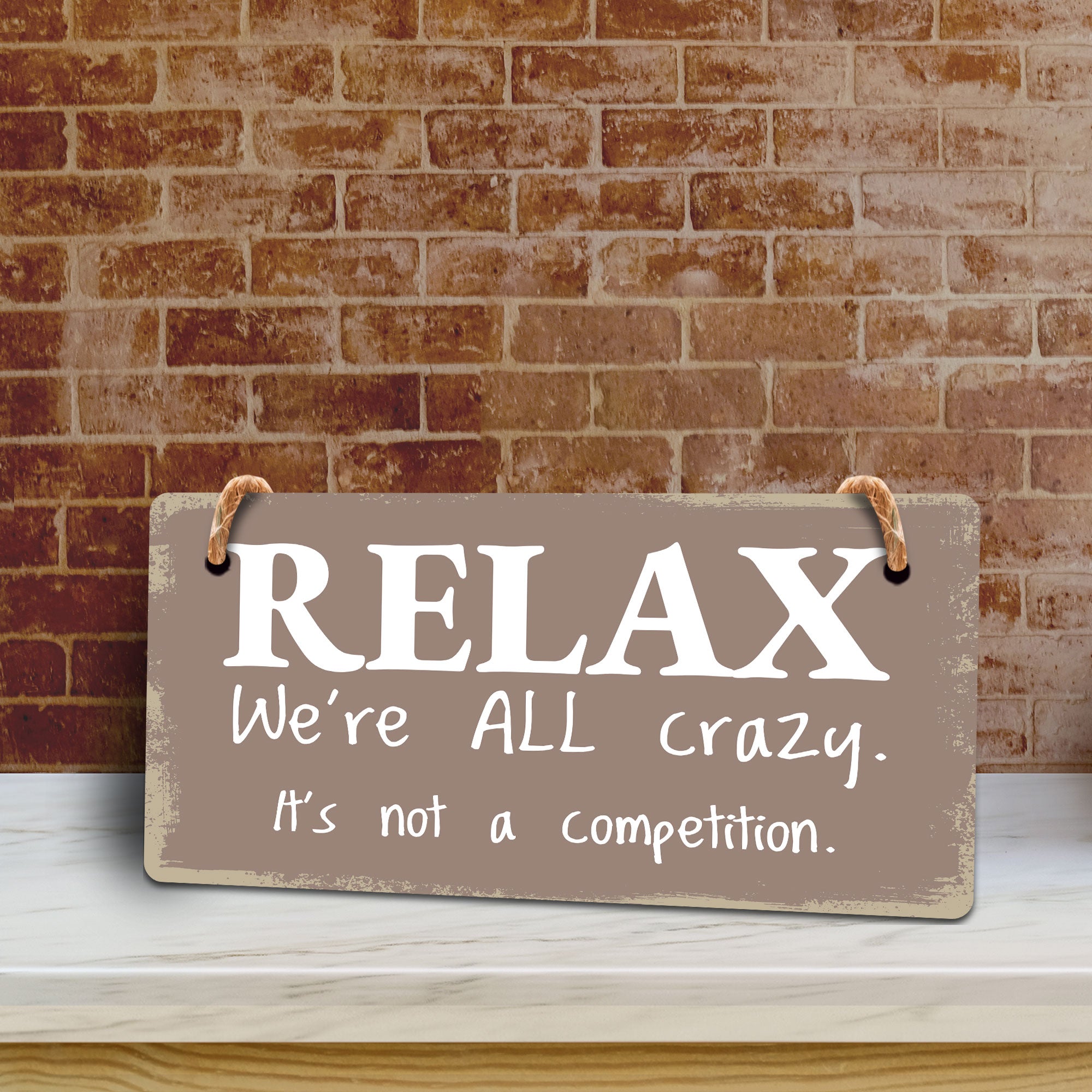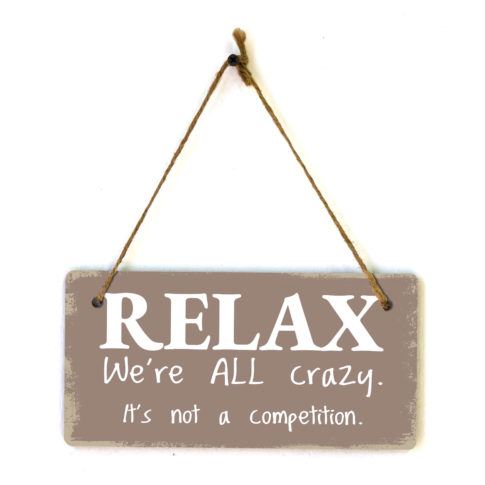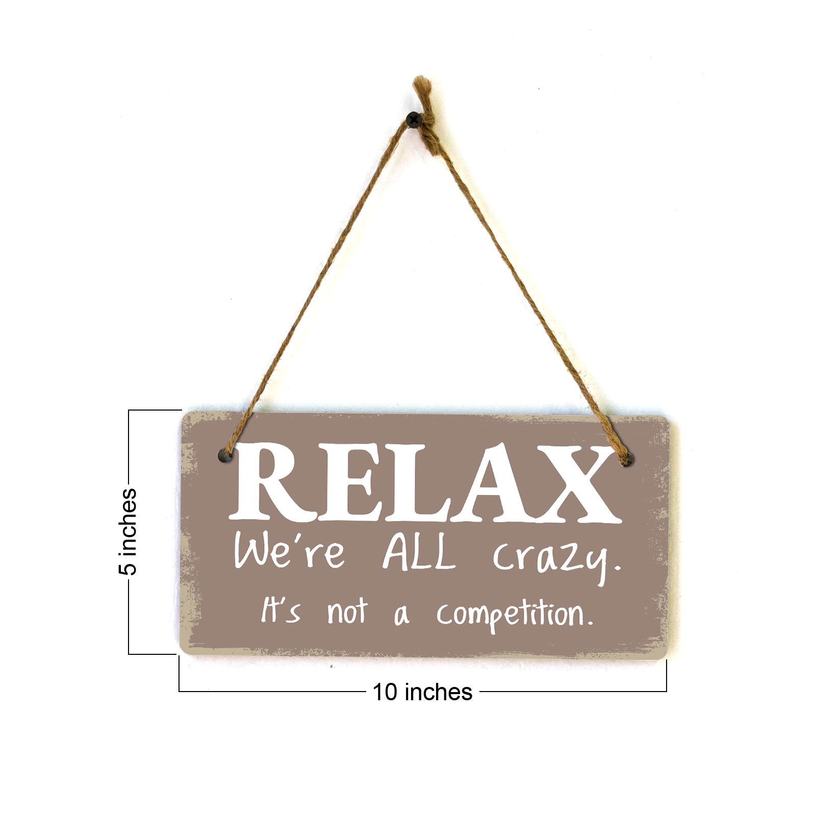 Introducing our versatile and stylish Relax We're All Crazy. It's Not A Competition., the perfect blend of style and sophistication to elevate your home or workplace. Our 5x10 Hanging Sign range is the perfect choice for your home, workplace or business. Each sign is attached with rustic twine, providing a charming and versatile accent for any space. Our curated designs effortlessly complement a variety of styles, from rustic farmhouse or Modern Chic, to simple and functional options. Choose from our diverse range of designs to personalize your space. Whether it's a warm welcome at the entrance, a motivational quote for your workspace, or a playful touch for the kids' room, our Hanging Wall or Door Signs are the perfect way to express your unique style.