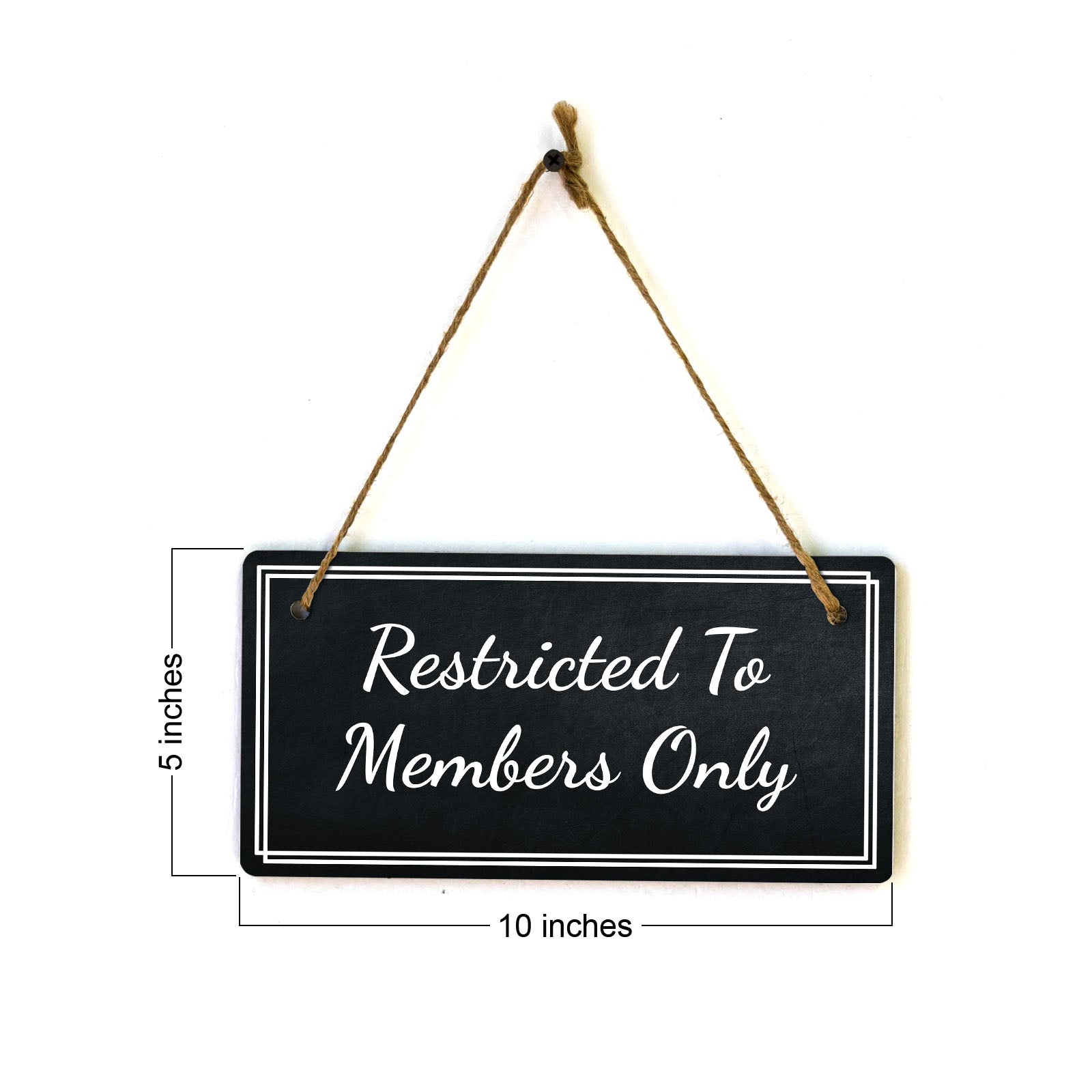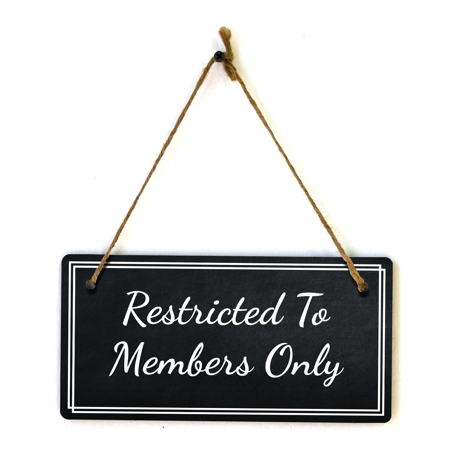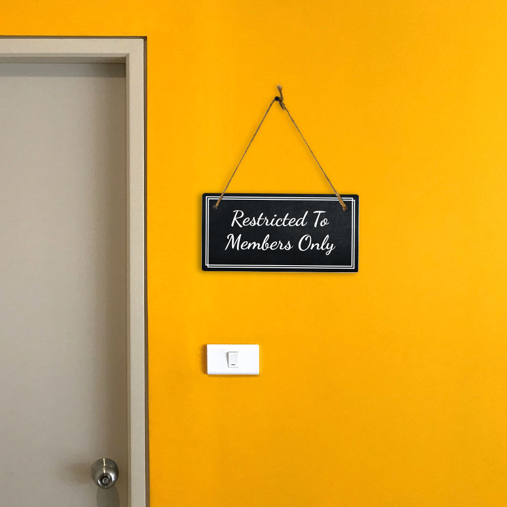Introducing our versatile and stylish Restricted To Members Only, the perfect blend of style and sophistication to elevate your home or workplace. Our 5x10 Hanging Sign range is the perfect choice for your home, workplace or business. Each sign is attached with rustic twine, providing a charming and versatile accent for any space. Our curated designs effortlessly complement a variety of styles, from rustic farmhouse or Modern Chic, to simple and functional options. Choose from our diverse range of designs to personalize your space. Whether it's a warm welcome at the entrance, a motivational quote for your workspace, or a playful touch for the kids' room, our Hanging Wall or Door Signs are the perfect way to express your unique style.