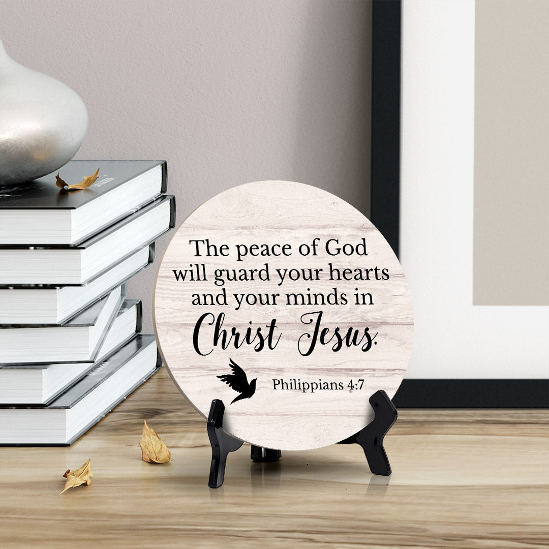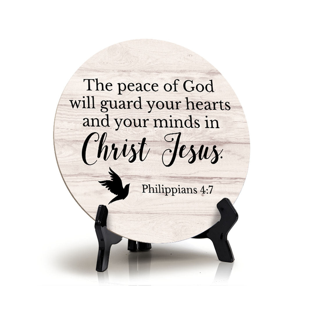 Round The Peace Of God Will Guard Your Hearts And Your Minds In Christ Jesus. Philippians 4:7, Decorative Bible Verses Table Sign. This table sign comes with it's own black acrylic easel, easy to set up and display on any flat surface.