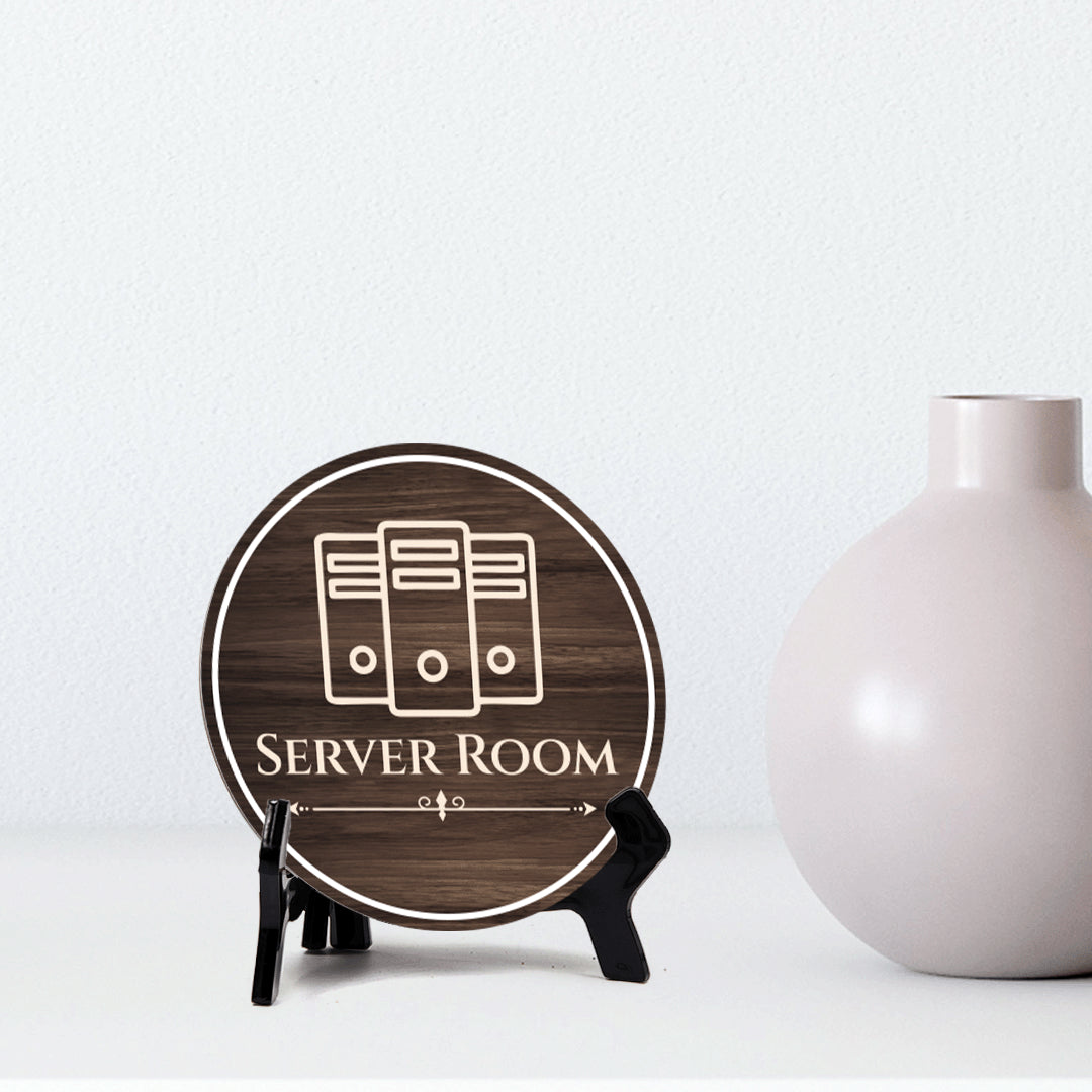 Server Room, 5x5 Circle Table Sign. This table sign comes with it's own black acrylic easel, easy to set up and display on any flat surface.