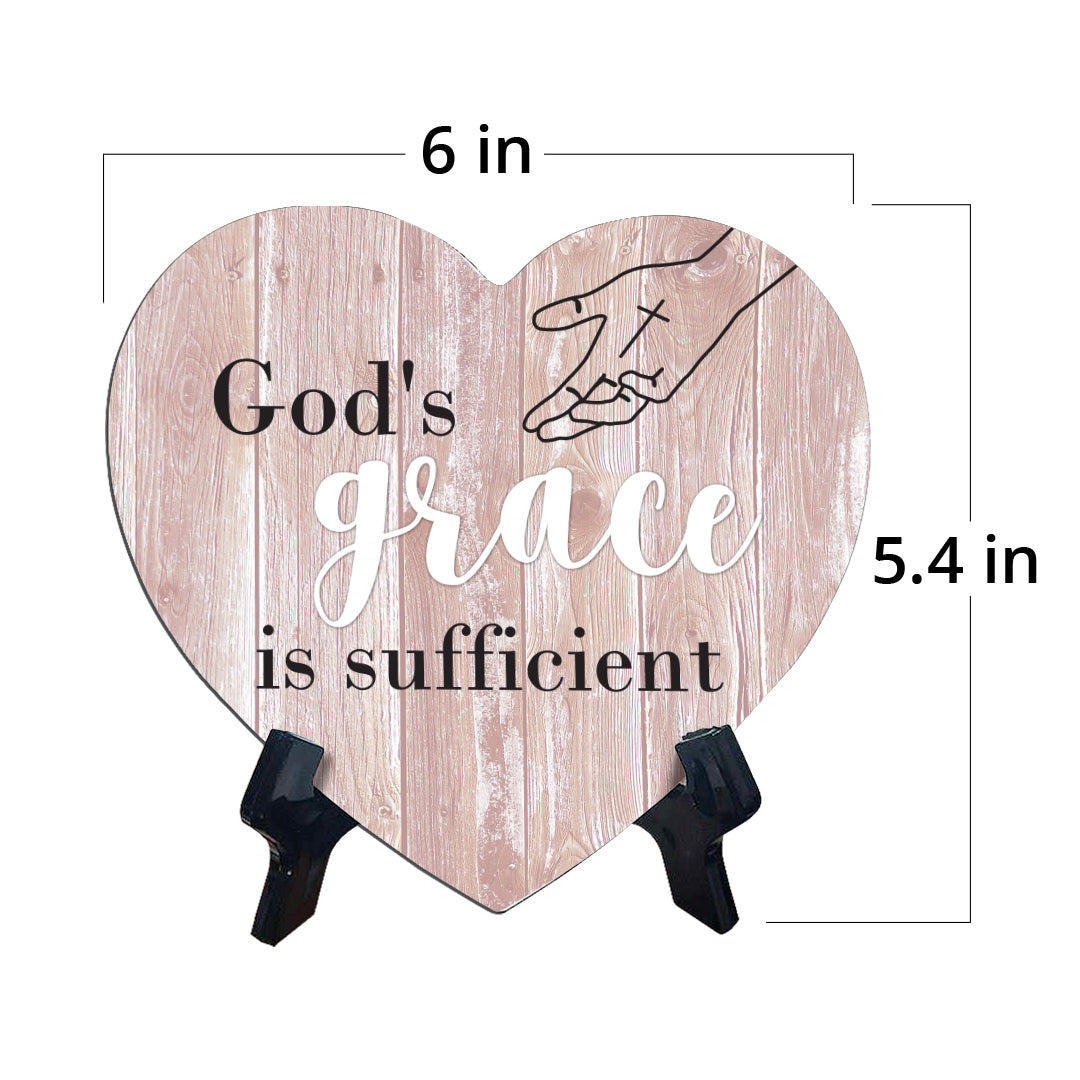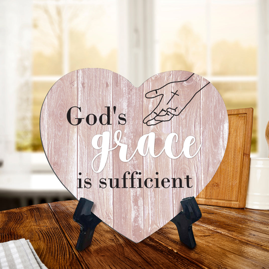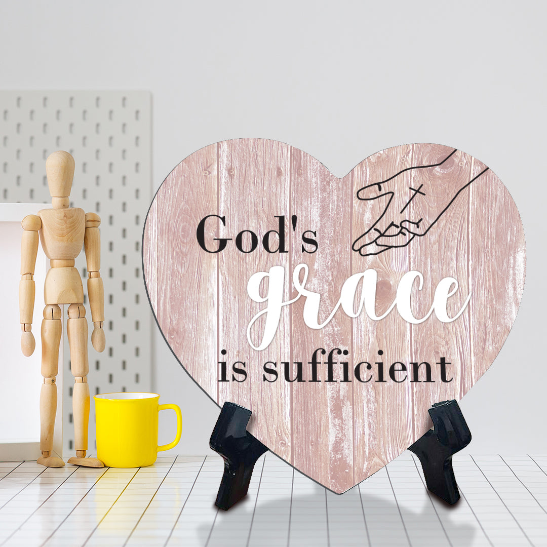 God's grace is sufficient, Wood Color, Heart Table Sign. This table sign comes with it's own black acrylic easel, easy to set up and display on any flat surface.
